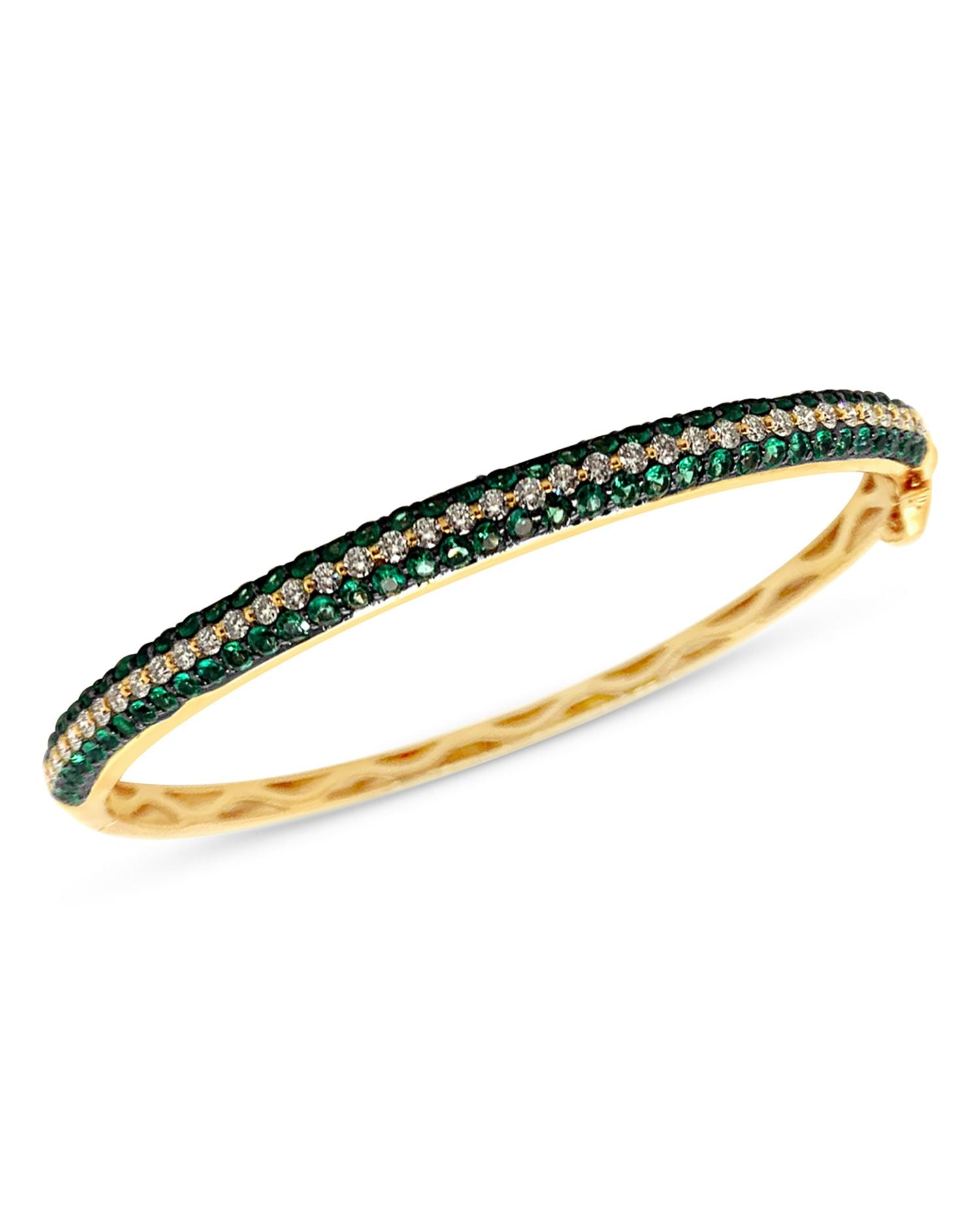 Handcrafted in 14K yellow gold with 1.54 ct. t.w. emeralds and 0.18 ct. t.w. diamonds. Bangle measures 2.5' in diameter and is secured with a tongue clasp closure.