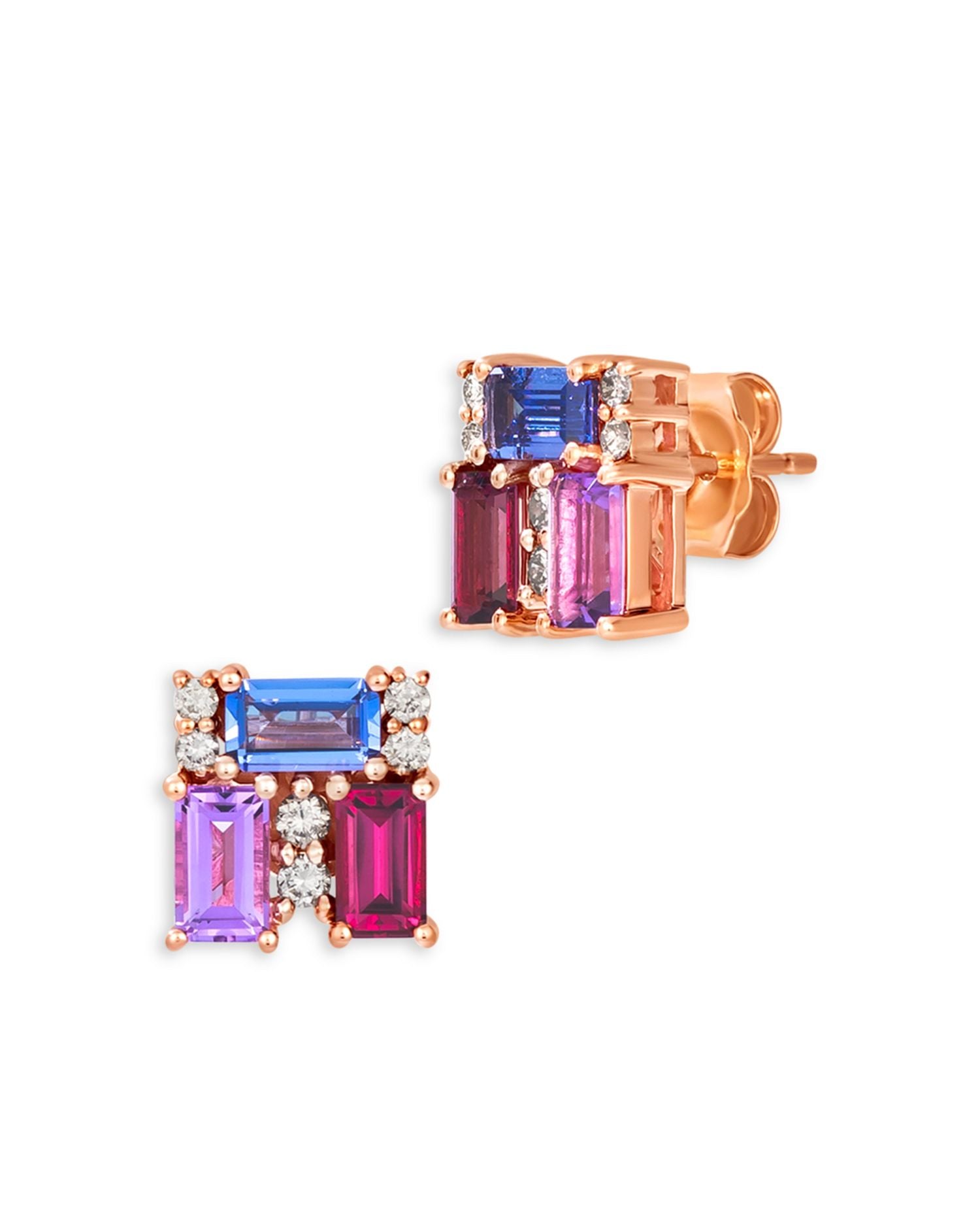 Multi Gemstone & Diamond Square Cluster Stud Earrings in 14K Rose Gold