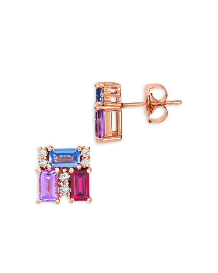 Handcrafted in 14K rose gold, featuring champagne diamonds totaling 0.17 carats alongside tanzanite, rhodolite, and amethyst. Earrings measure 0.4 inches in diameter and are secured with post-back closures. All gemstone carat weights are approximate, with a variance of 0.05 carats.