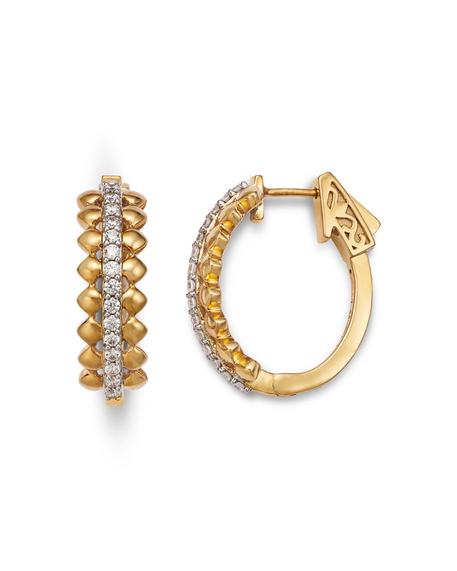 Handcrafted in 14K white and yellow gold, featuring diamonds totaling 0.50 carats (color/clarity: HI/I1-I2). Earrings have a 0.86-inch diameter and are secured with vault clasp closures. Rhodium-plated for enhanced shine, with potential for wear over time. Made in India.