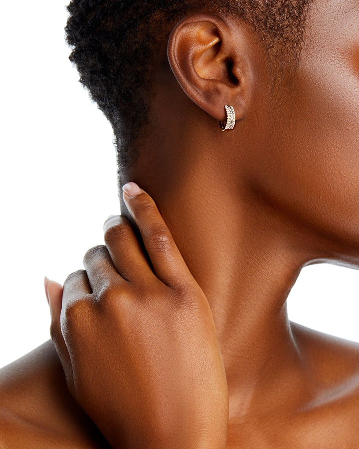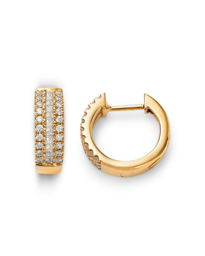 These Diamond Hoop Earrings by Bloomingdale's Fine Collection showcase a glamorous three-row design with a mix of round and baguette diamonds, creating a luxurious and radiant look. Perfect for elevating any outfit.