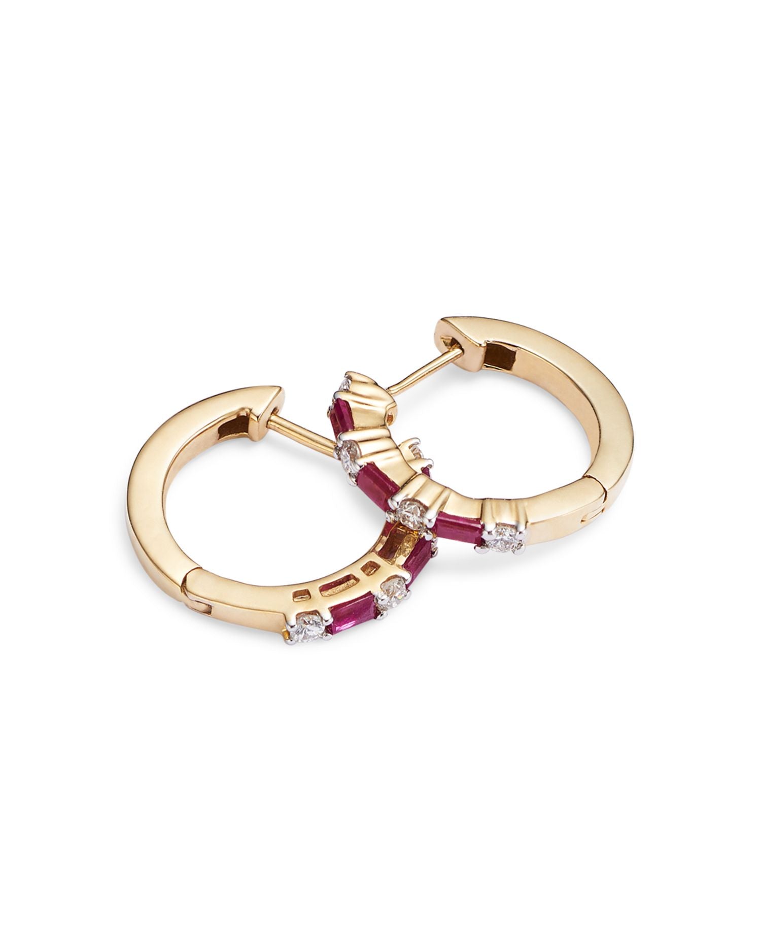 These Ruby & Diamond Huggie Hoop Earrings by Bloomingdale's Fine Collection feature alternating ruby baguettes and glistening diamonds, creating an elegant design perfect for adding a touch of luxury to any look.