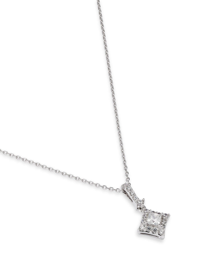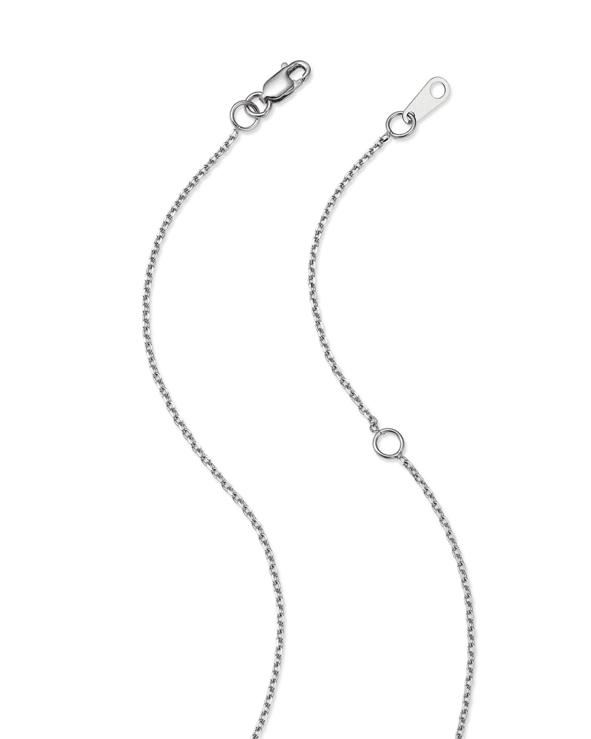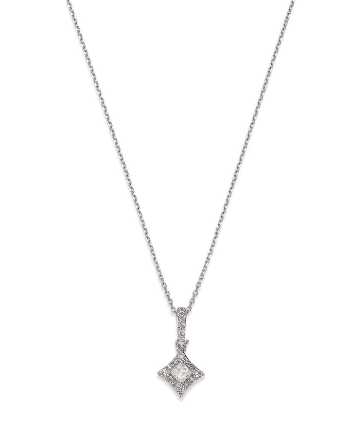 Handcrafted in 14K white gold with 0.50 carats total weight of diamonds (color/clarity: HI/I1I2). The chain measures 18 inches, with a 0.625-inch pendant, and secures with a lobster clasp. The white gold is surface-coated with rhodium for enhanced shine, which may require replating over time. All carat weights are approximate, with a variance of up to 0.05 carats.