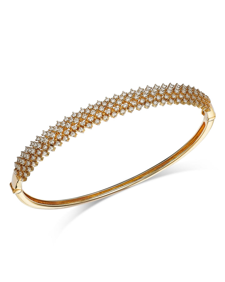 This Diamond Cluster Bangle Bracelet by Bloomingdale's Fine Collection exudes timeless elegance. Featuring a dazzling array of diamond clusters set in yellow gold, this bracelet adds a radiant touch to any outfit, perfect for special occasions or everyday sophistication.