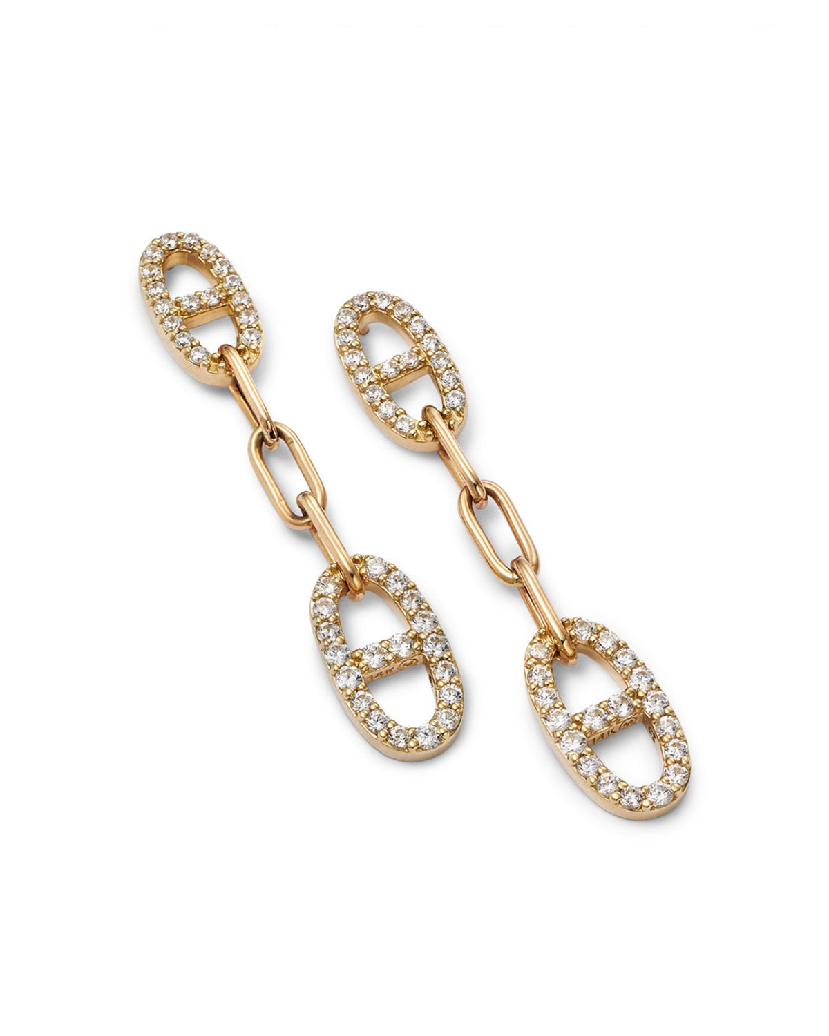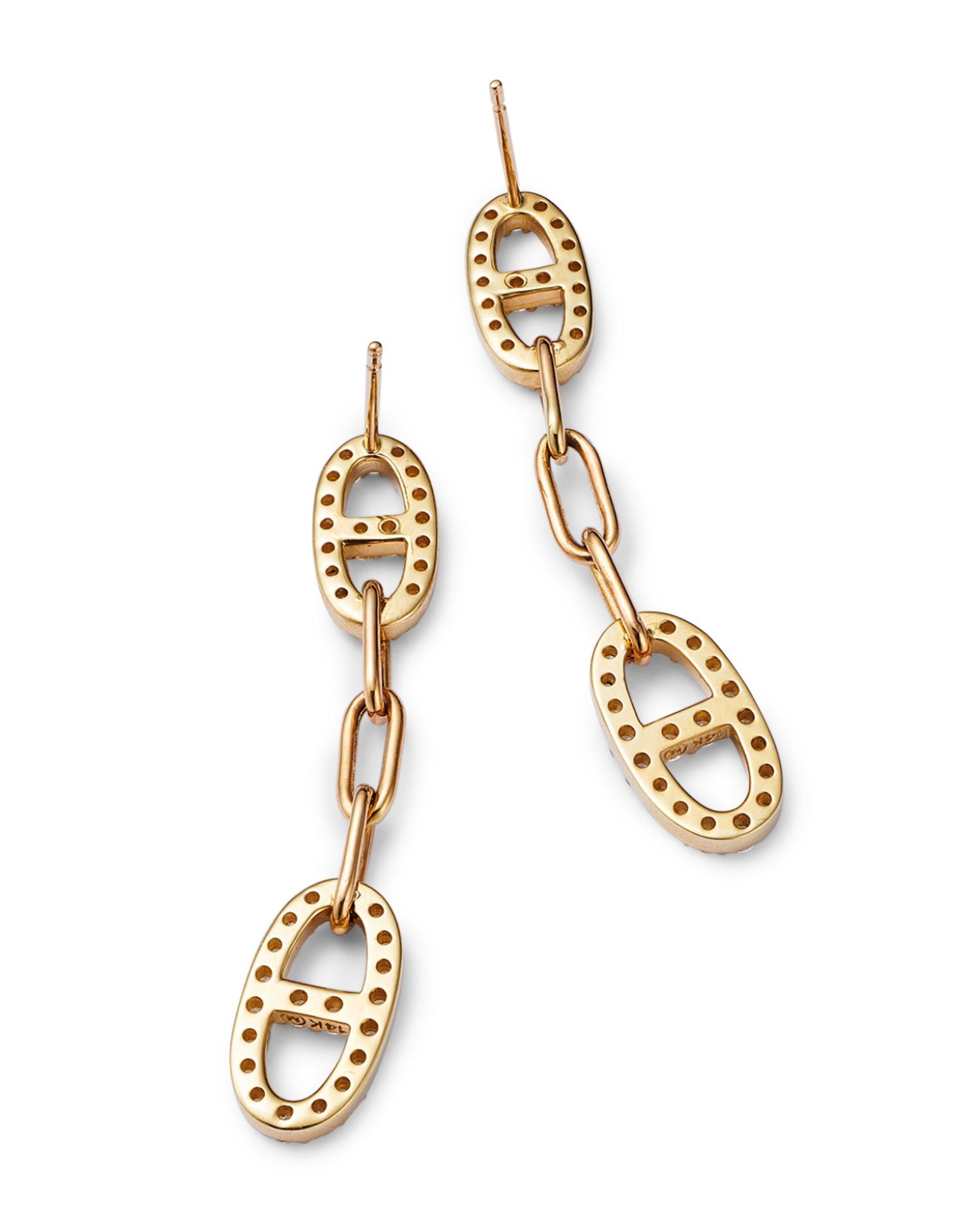 These Diamond Link Drop Earrings by Bloomingdale's Fine Collection are a dazzling addition to any jewelry wardrobe. Featuring oval-shaped diamond pavé links in a drop design, these yellow gold earrings bring elegance and sparkle to every movement.