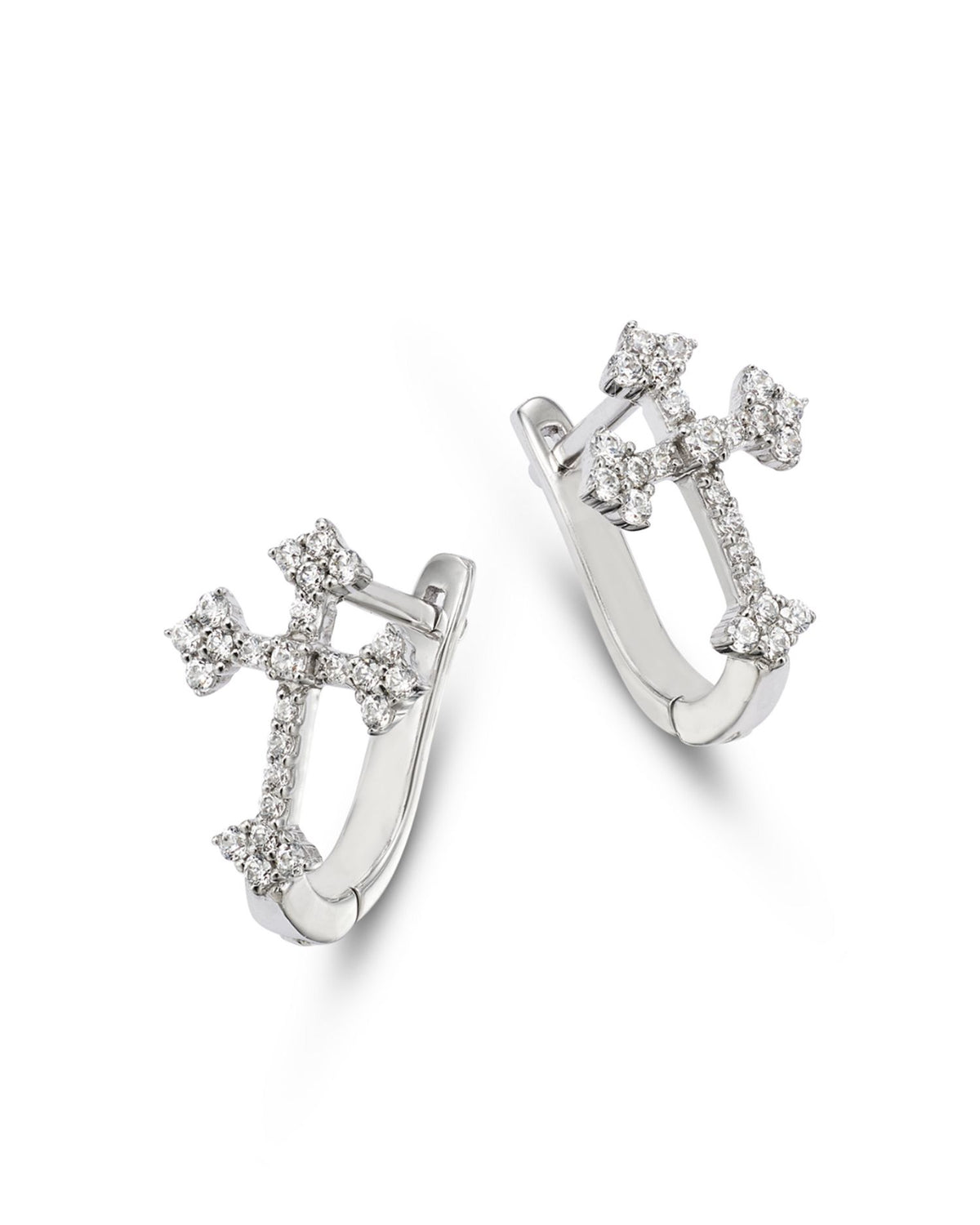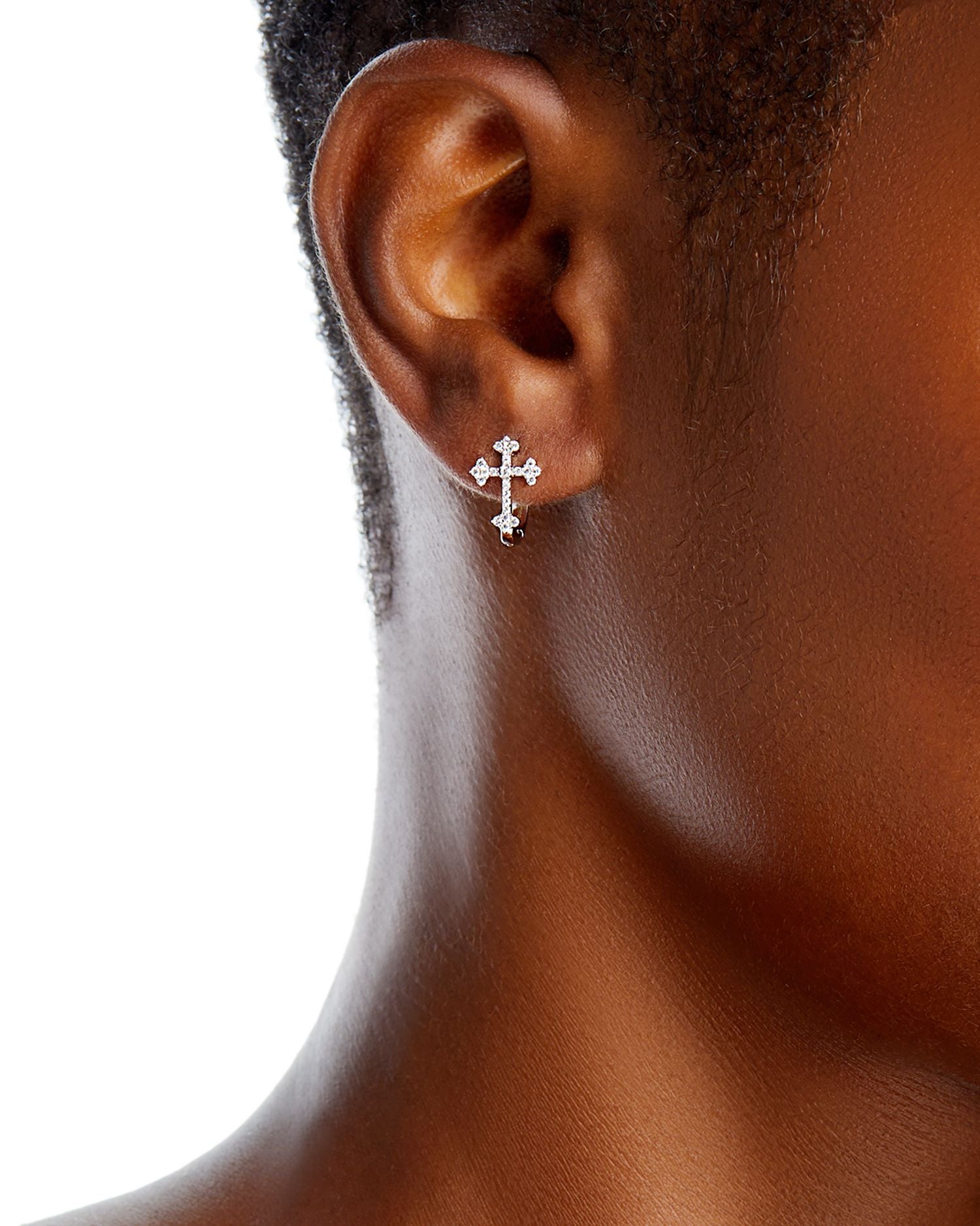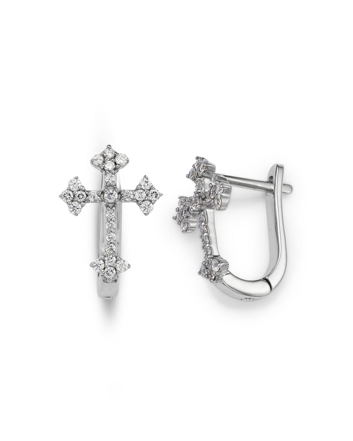 These diamond cross hoop earrings by Bloomingdale's Fine Collection are a sophisticated expression of faith and style. Featuring ornate diamond crosses, this polished white gold design is elegant and timeless.