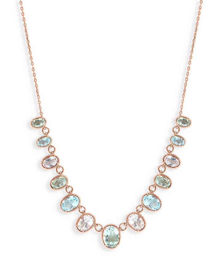 This prasiolite, blue topaz, and morganite collar necklace by Bloomingdale's Fine Collection exudes subtle elegance. Delicate gemstones in soft hues are beautifully showcased against a luxurious rose gold setting, making this piece an exquisite choice for refined style.