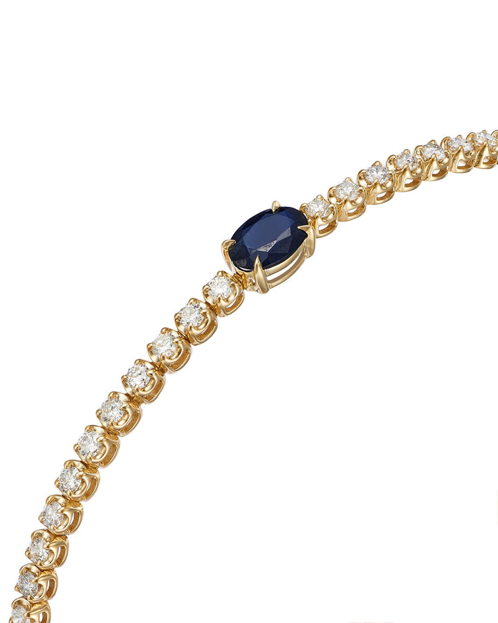 This Blue Sapphire & Diamond Station Tennis Bracelet in 14K Yellow Gold by Bloomingdale's Fine Collection exudes unparalleled sophistication. Featuring dazzling oval-cut natural blue sapphires and sparkling diamonds, this tennis bracelet is a statement of refined elegance.