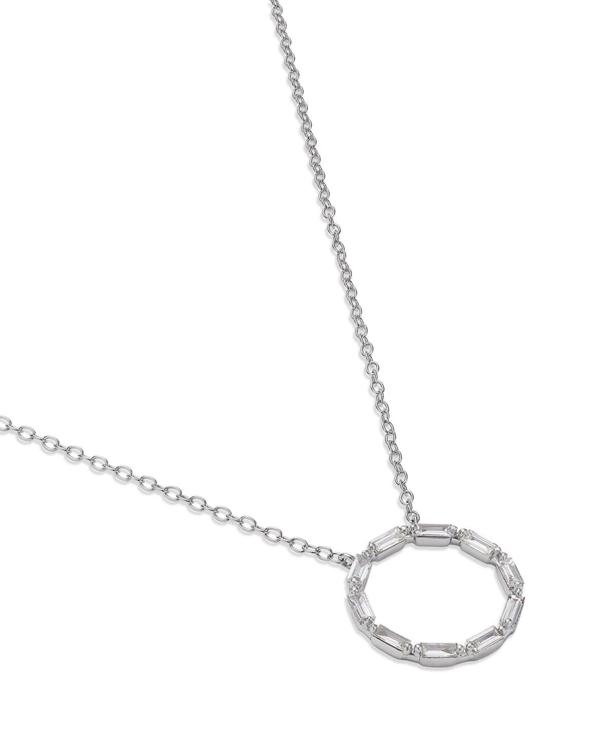 This Diamond Circle Pendant Necklace by Bloomingdale's Fine Collection is a timeless design. Featuring ten baguette-shaped diamonds set in a circular pendant, this piece offers a refined elegance perfect for any occasion. Its sleek white gold chain adds a modern touch to this classic design.