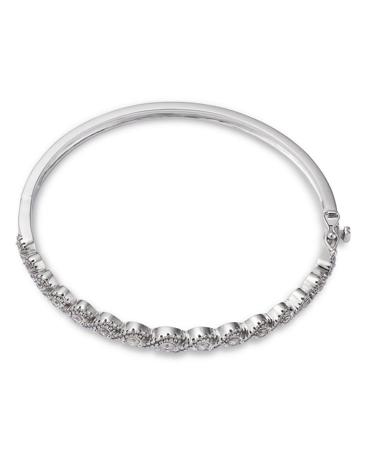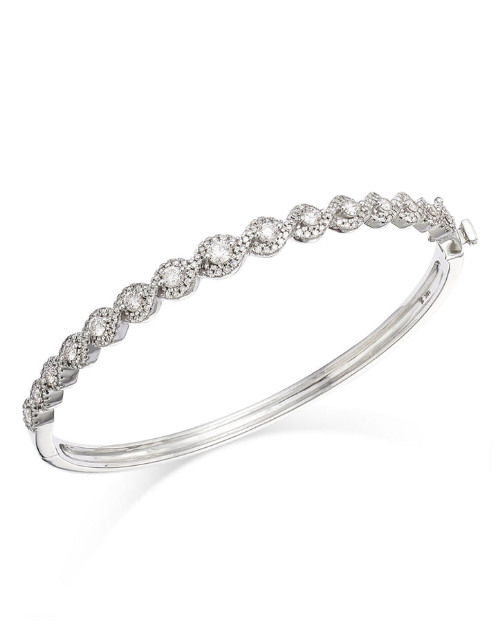 This Diamond Halo Bracelet by Bloomingdale's Fine Collection exudes glamour, featuring dazzling halo-framed diamonds set on a polished 14K white gold bangle. An elegant piece perfect for elevating evening attire.