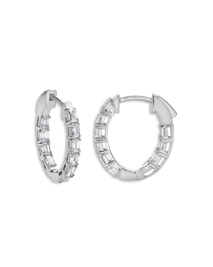 Handcrafted in 14K white gold with rhodium plating, featuring emerald-cut diamonds (2.0 ct. t.w.; HI/SI1SI2 clarity). Hoops measure 0.75' in diameter with a hinge hoop closure. Made in India.