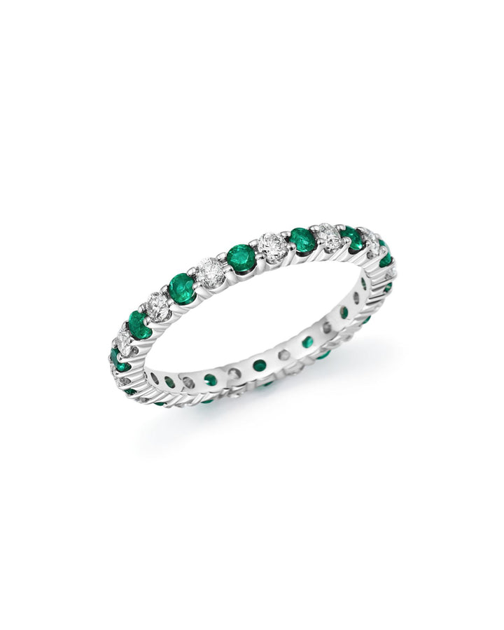 This Diamond and Emerald Eternity Band by Bloomingdale's Fine Collection is a slim and sophisticated design. Featuring alternating emeralds and diamonds in 14K white gold, this band brings timeless elegance and vibrant color to your collection. Emerald is also the birthstone for May, making it a meaningful choice.