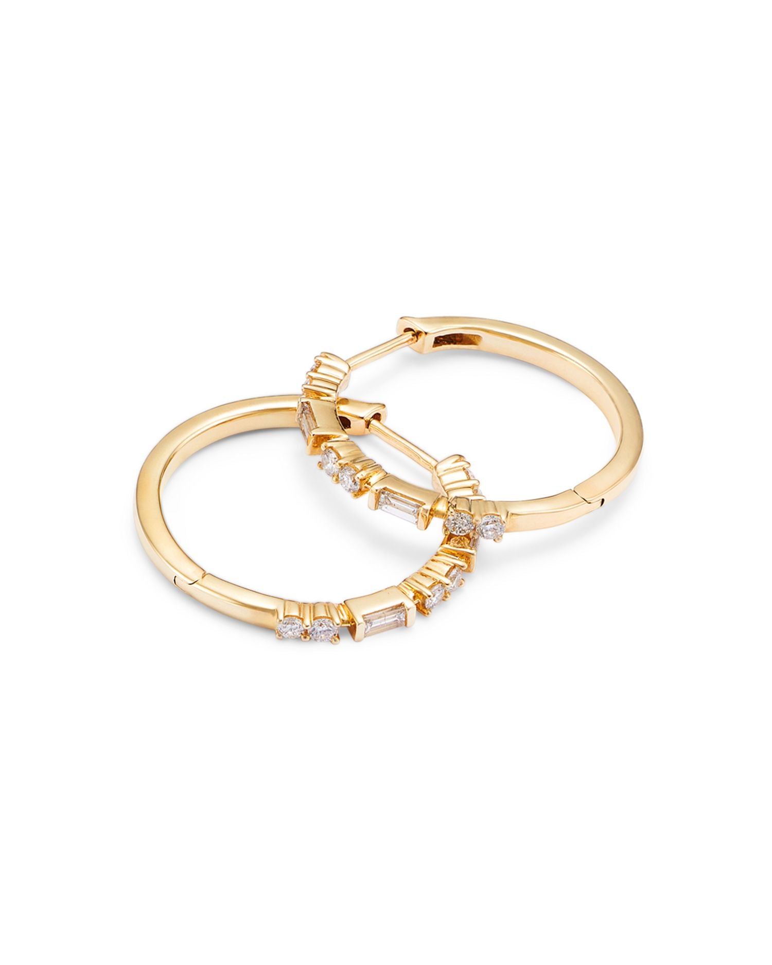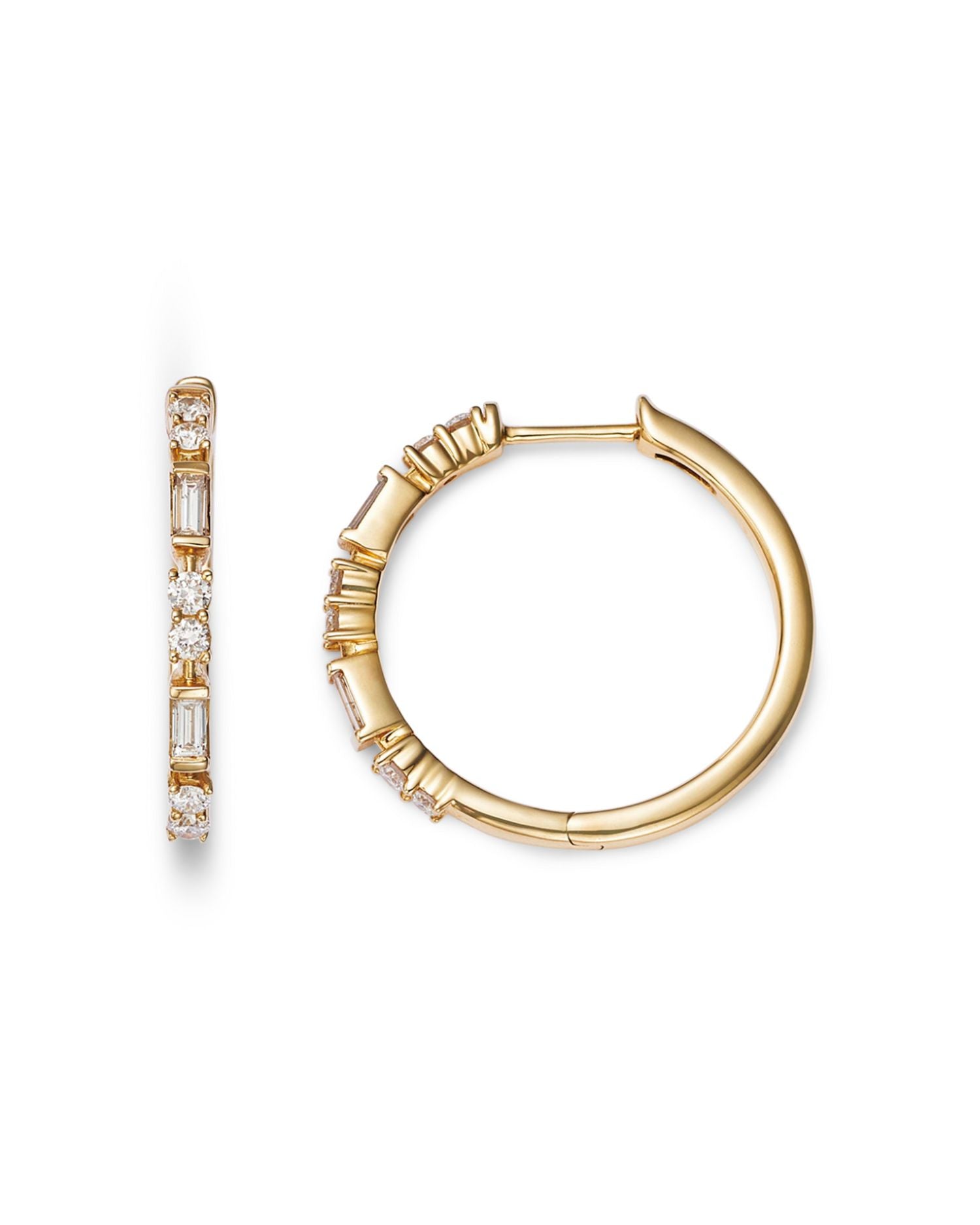 These Diamond Hoop Earrings by Bloomingdale's Fine Collection bring classic elegance to your jewelry collection. Featuring a mix of round and baguette-cut diamonds, these gold hoops exude glamour and timeless sparkle, perfect for elevating any look.