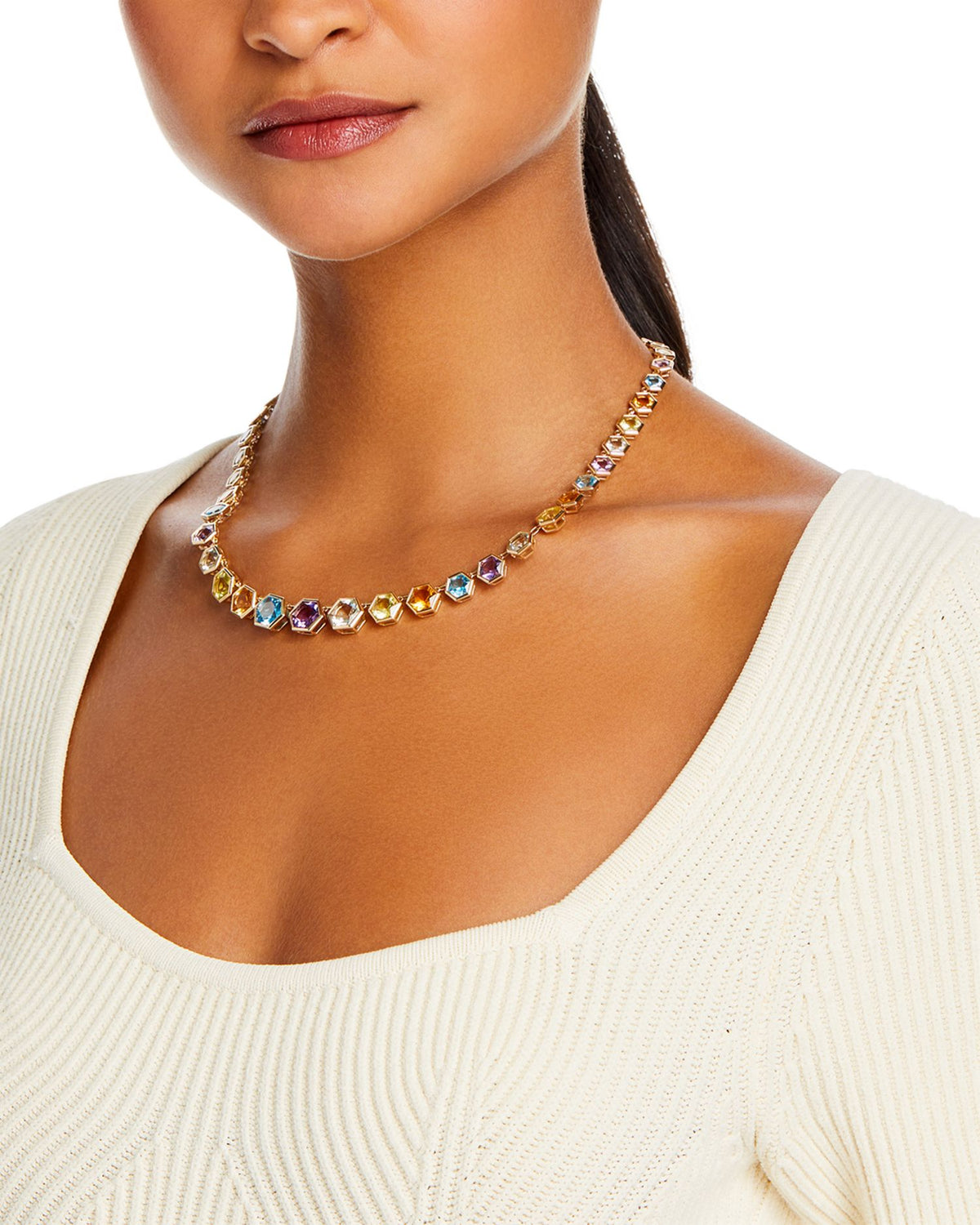 This Multi Gemstone Hexagon Collar Necklace by Bloomingdale's Fine Collection is a vibrant and captivating piece. Featuring colorful hexagon-cut gemstones in amethyst, prasiolite, blue topaz, citrine, and lemon quartz, this yellow gold collar necklace brings a radiant glow to your neckline.