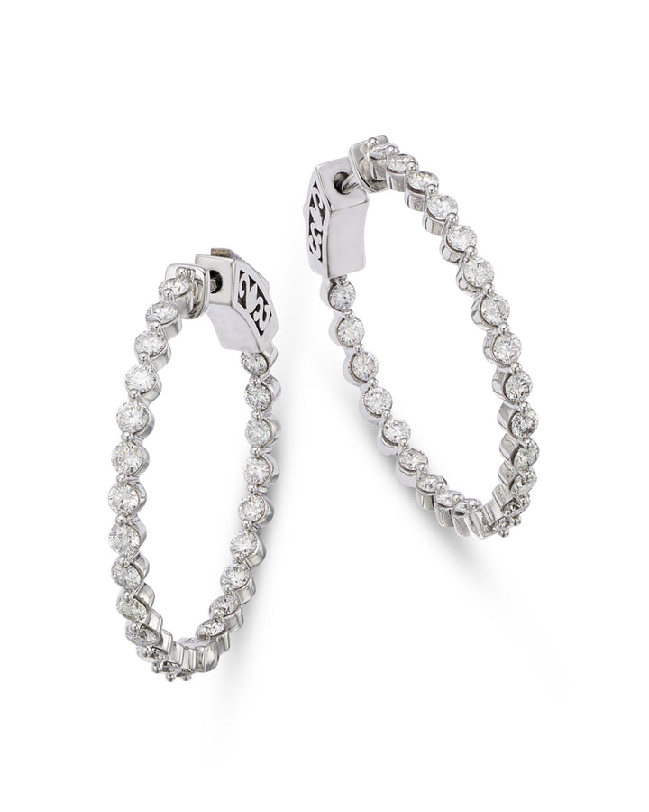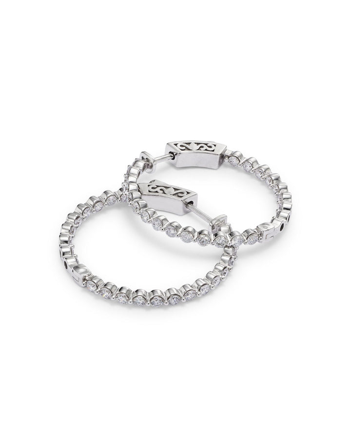 Handcrafted in 14K white gold with rhodium plating, featuring diamonds (1.50 ct. t.w.; GH/SI2 clarity). Hoops measure 1.07' in diameter with vault clasp closures. Made in India.
