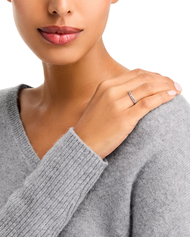 This Diamond Double Row Band by Bloomingdale's Fine Collection offers a sleek and sophisticated design. Two rows of sparkling diamonds adorn the top of the polished white gold band, creating an elegant and timeless piece. This ring is perfect for adding a touch of luxury to any occasion, whether worn alone or stacked with other pieces. Its minimalist yet striking design makes it a versatile addition to any jewelry collection.