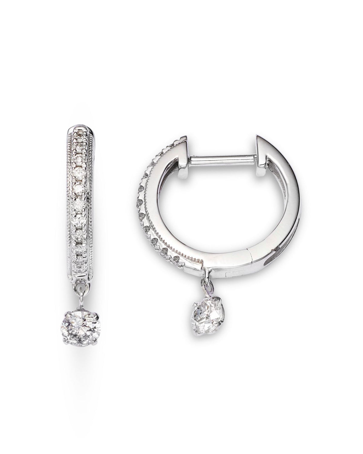 Made in 14K white gold with 0.42 carats of diamonds (color/clarity: HI/I1-I2). The earrings measure 0.625" in length, and feature a hinge hoop closure. White gold is surface-coated with rhodium to enhance the metal’s shine, though it may require replating over time. All gemstone carat weights are approximate, with variance of 0.05 carat. Made in India.