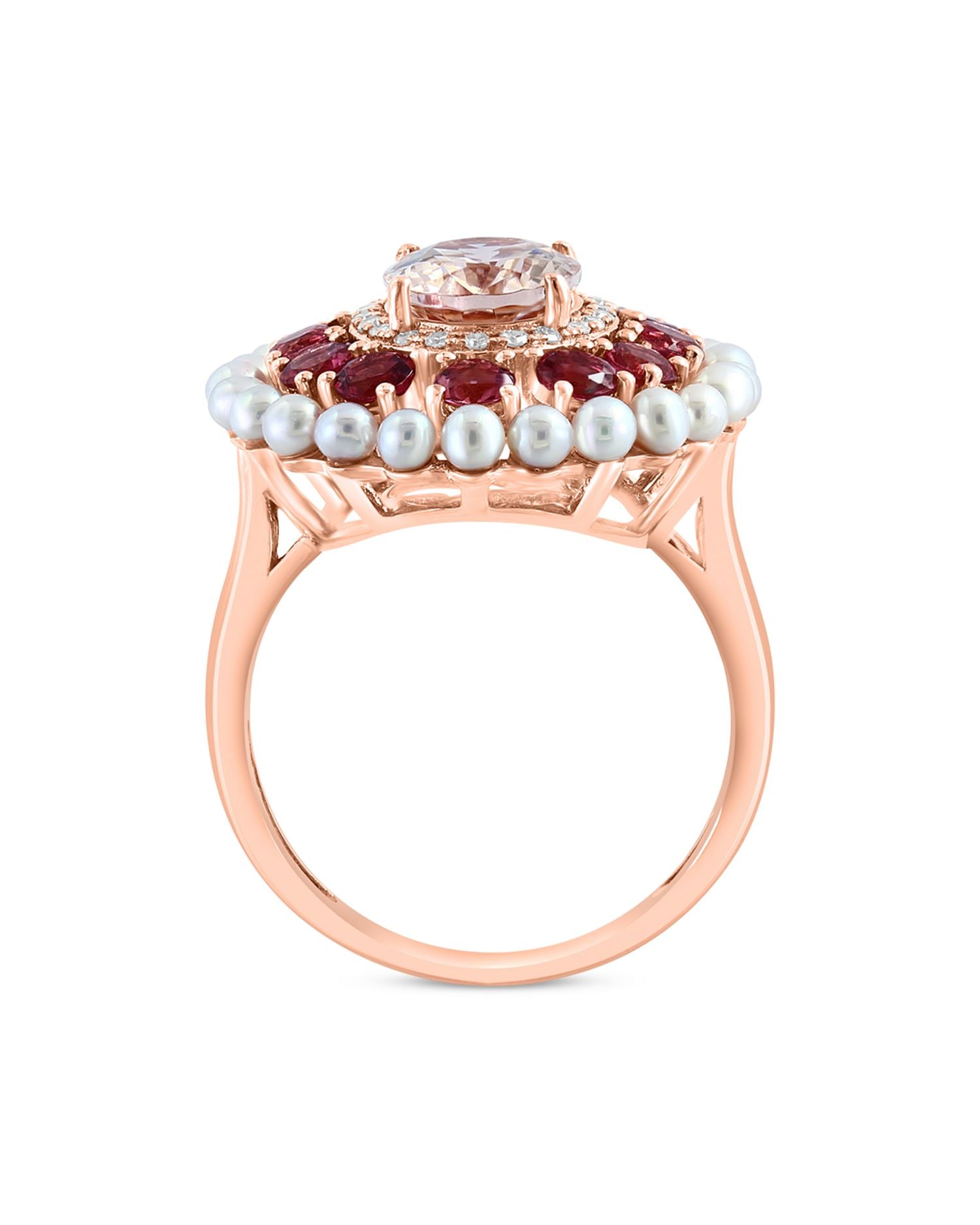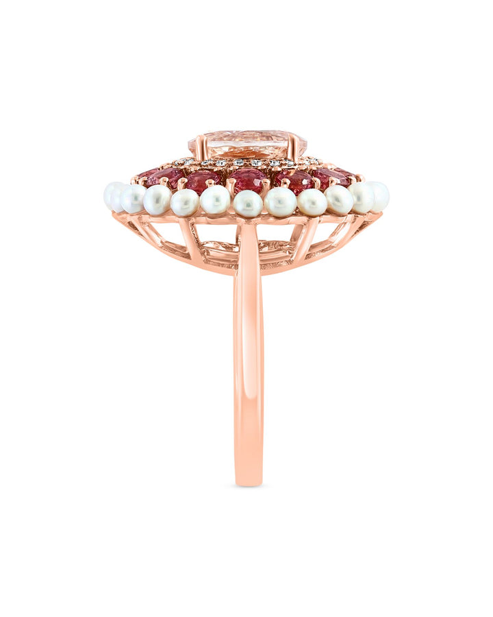 Handcrafted in 14K rose gold with 0.01 carats of diamonds (color/clarity: HI/I1-I2). The morganite gemstone measures 9.0mm x 7.0mm, the pink tourmaline is 3.0mm, and the cultured freshwater pearls are 2.0mm. Size 7. All gemstone carat weights are approximate, with variance of 0.05 carat.