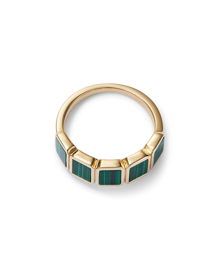 This Malachite Ring by Bloomingdale's Fine Collection is a bold yet elegant design featuring vibrant malachite stones set in polished 14K yellow gold. The unique green hues of the malachite add a touch of natural beauty, making it a striking addition to any jewelry collection.
