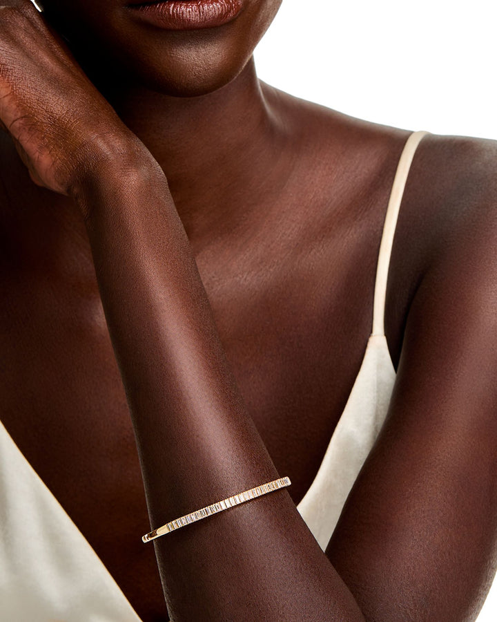 This Diamond Baguette Bangle Bracelet by Bloomingdale's Fine Collection is a sophisticated yet delicate design featuring diamond baguettes set in 14K yellow gold. Its refined style makes it perfect for both everyday elegance and special occasions.