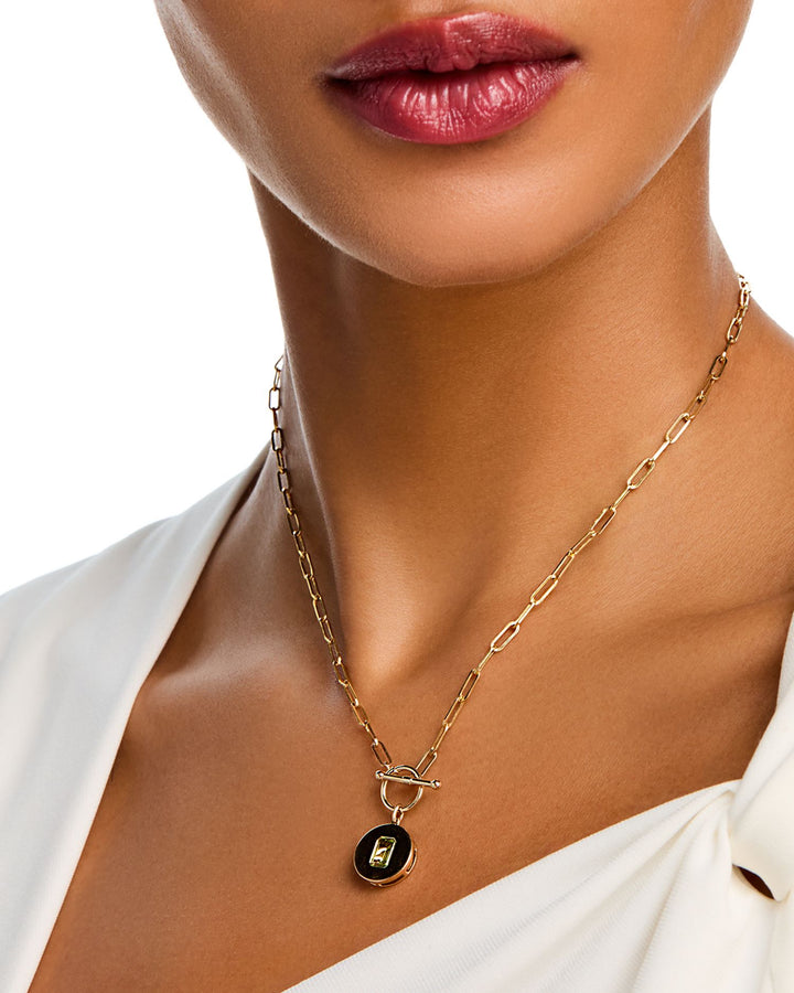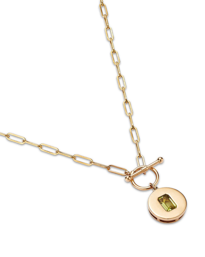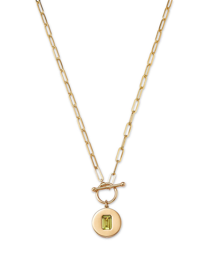 This 14K Yellow Gold Peridot Disc Pendant Necklace by Bloomingdale's Fine Collection is a radiant design featuring a shimmering peridot at the center of a polished disc. Finished with a cool toggle clasp, this necklace offers a fresh, vibrant look perfect for layering or wearing solo.