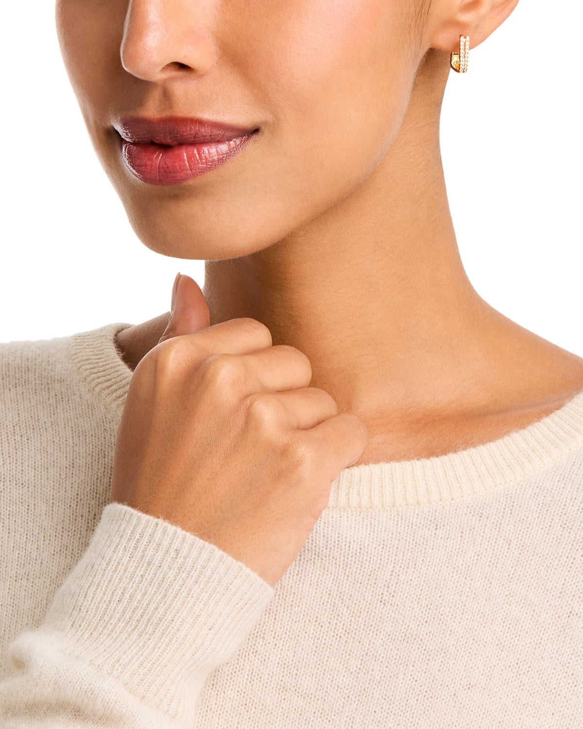 These Diamond Huggie Hoop Earrings by Bloomingdale's Fine Collection are a timeless accessory with a line of pavé diamonds set in polished yellow gold. A versatile piece, perfect for everyday wear or adding subtle sparkle to special occasions.