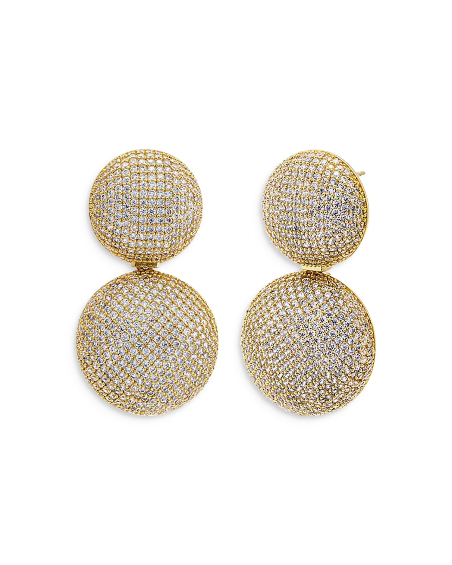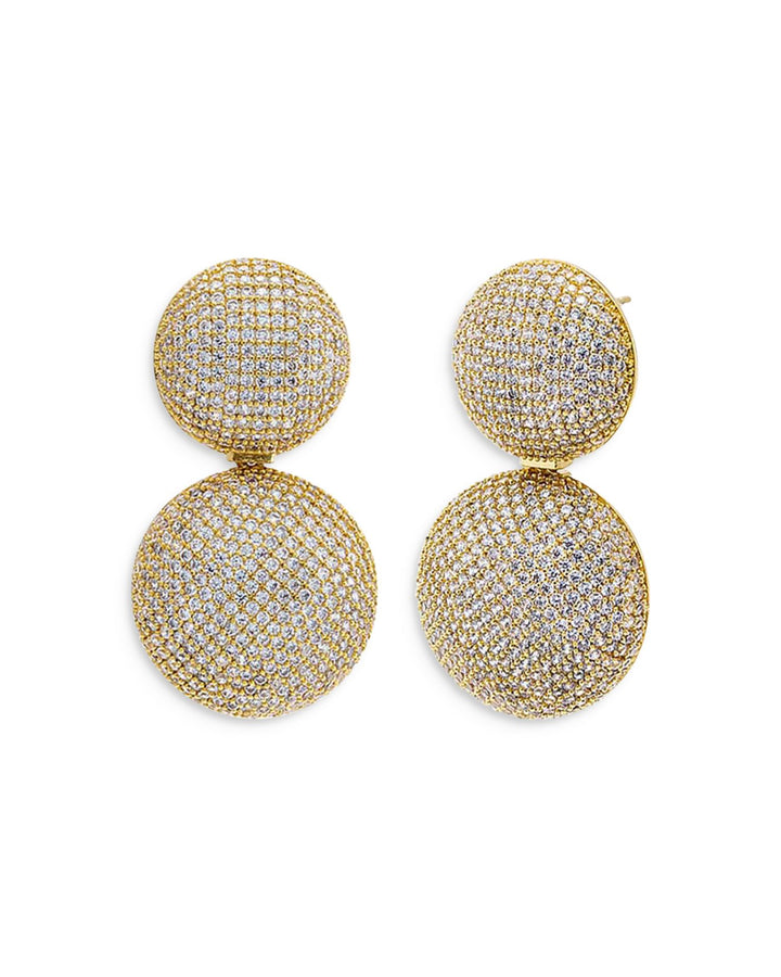These Pavé Puffy Double Circle Drop Stud Earrings by Adina Eden are a playful and chic addition to your jewelry collection. Featuring two interlinked puffed circles adorned with sparkling pavé cubic zirconia, these earrings strike the perfect balance between bold design and refined elegance. At 0.8 inches in length, they add a touch of glamour to any outfit, whether casual or formal.