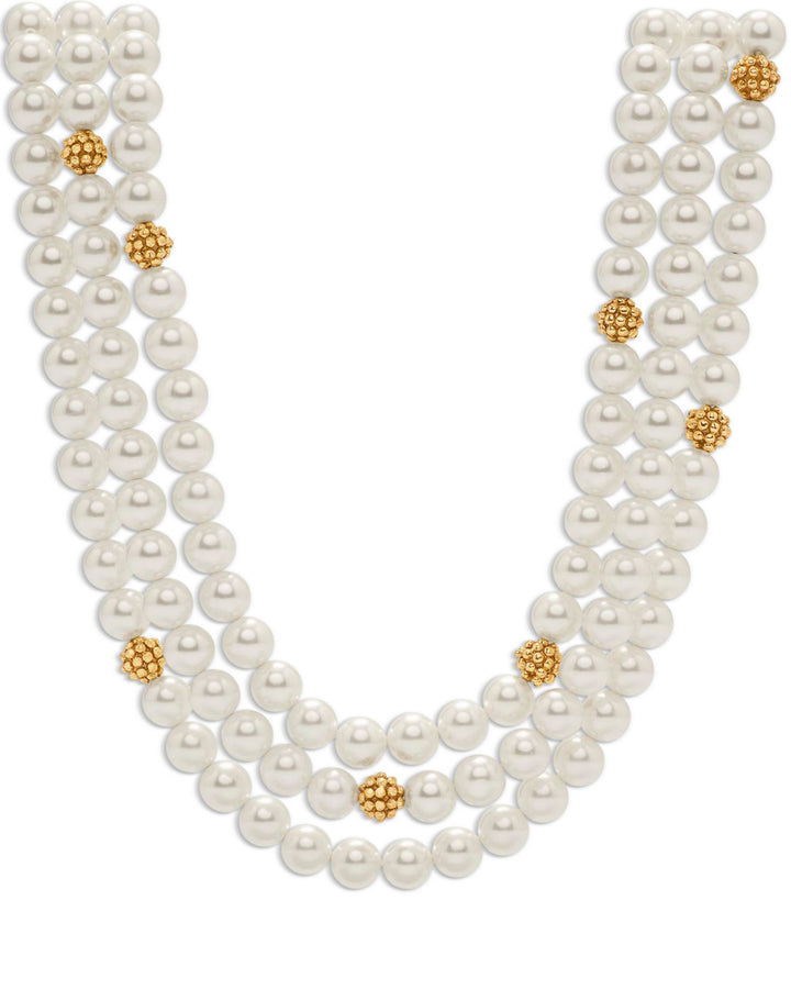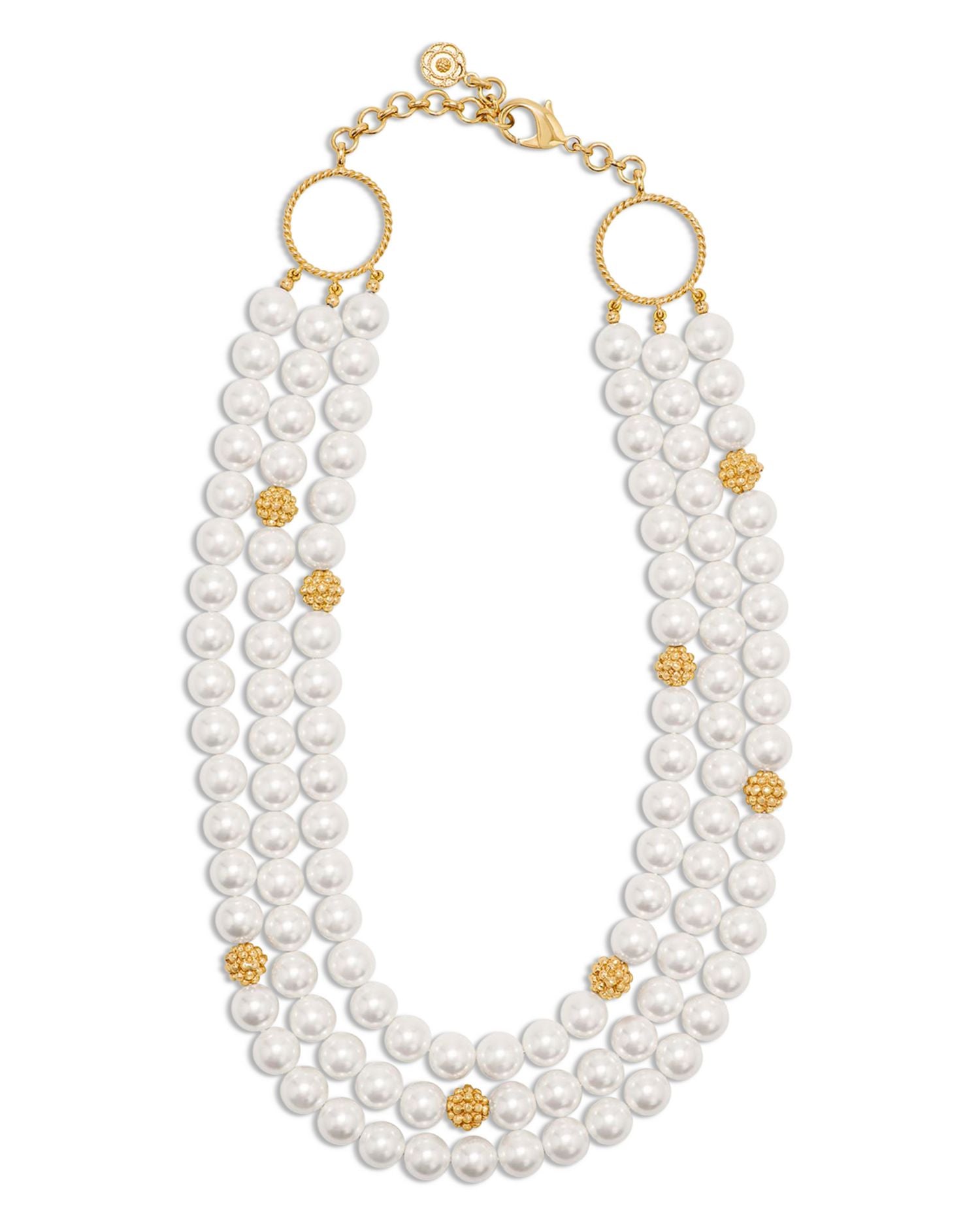 This Berry & Bead Triple Strand Necklace by Capucine De Wulf is a vibrant accessory that blends earthy and elegant elements. Featuring a layered design of jade or imitation shell pearls, it creates a dynamic and textured look. The 18-inch chain with a 2-inch extender makes it ideal for layering or wearing as a standalone statement piece.