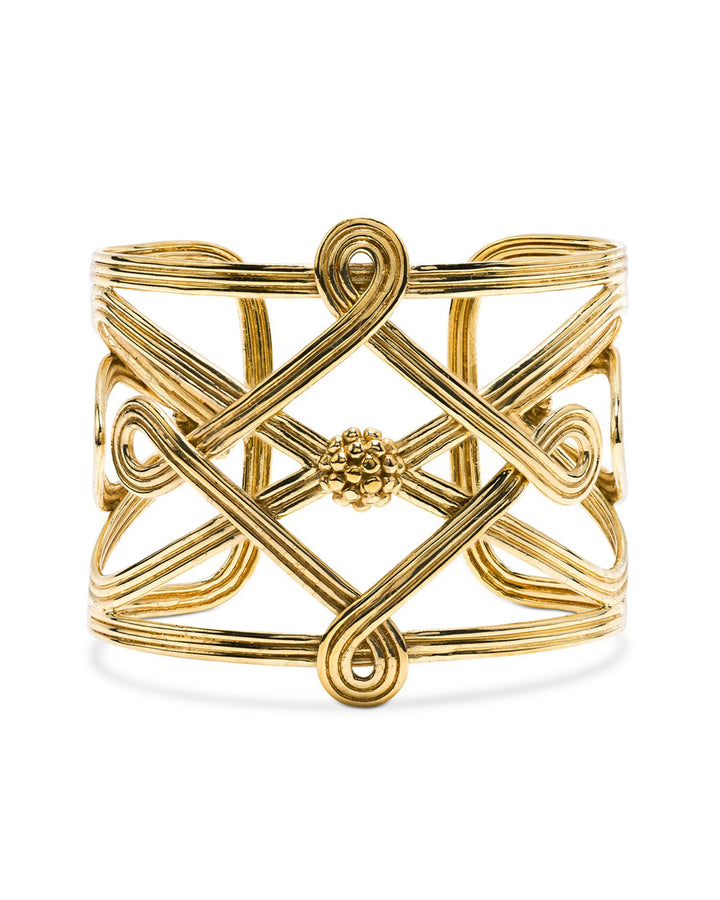 Handcrafted in 18K gold-plated brass, this cuff bracelet measures 2.25 inches in diameter and 2 inches wide. Made in India with exceptional attention to detail.