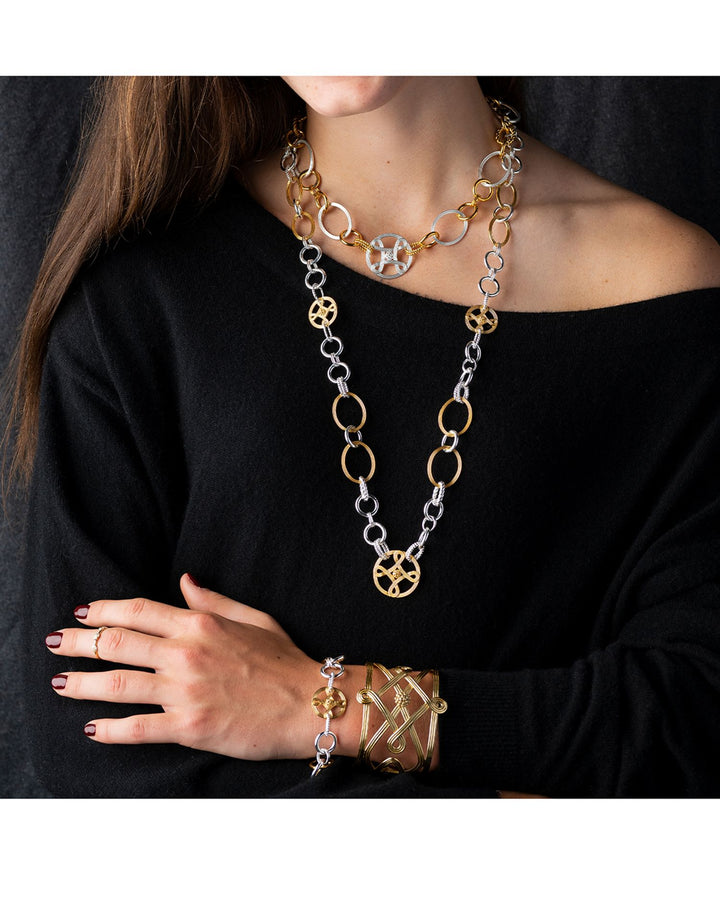 This Monique Compass Cuff Bracelet by Capucine De Wulf is more than a statement piece; it is a wearable symbol of guidance and self-trust. Featuring a subtle compass motif with north, south, east, and west points and a central berry to represent inner light, it inspires the wearer to follow their true path. Named after Monique De Wulf, the designer’s grandmother, this cuff embodies elegance, spiritual strength, and devotion. With its bold 2-inch width, it is a power piece for any occasion.