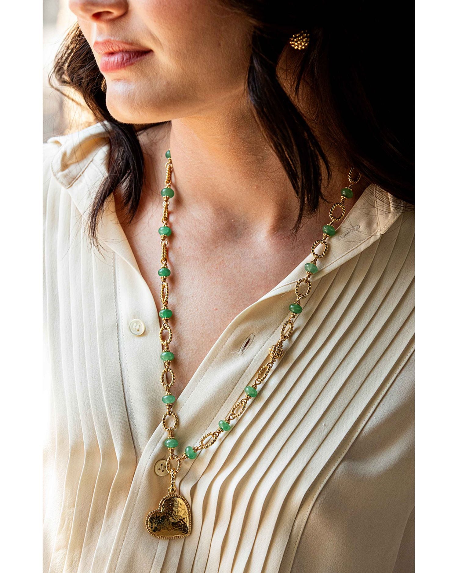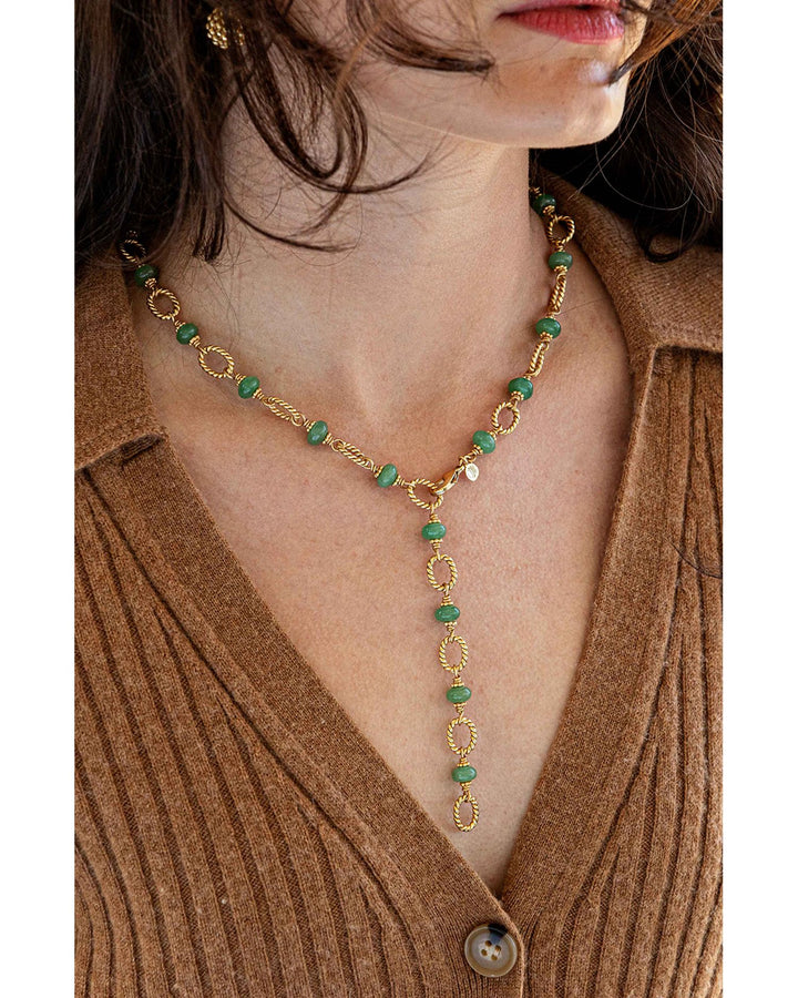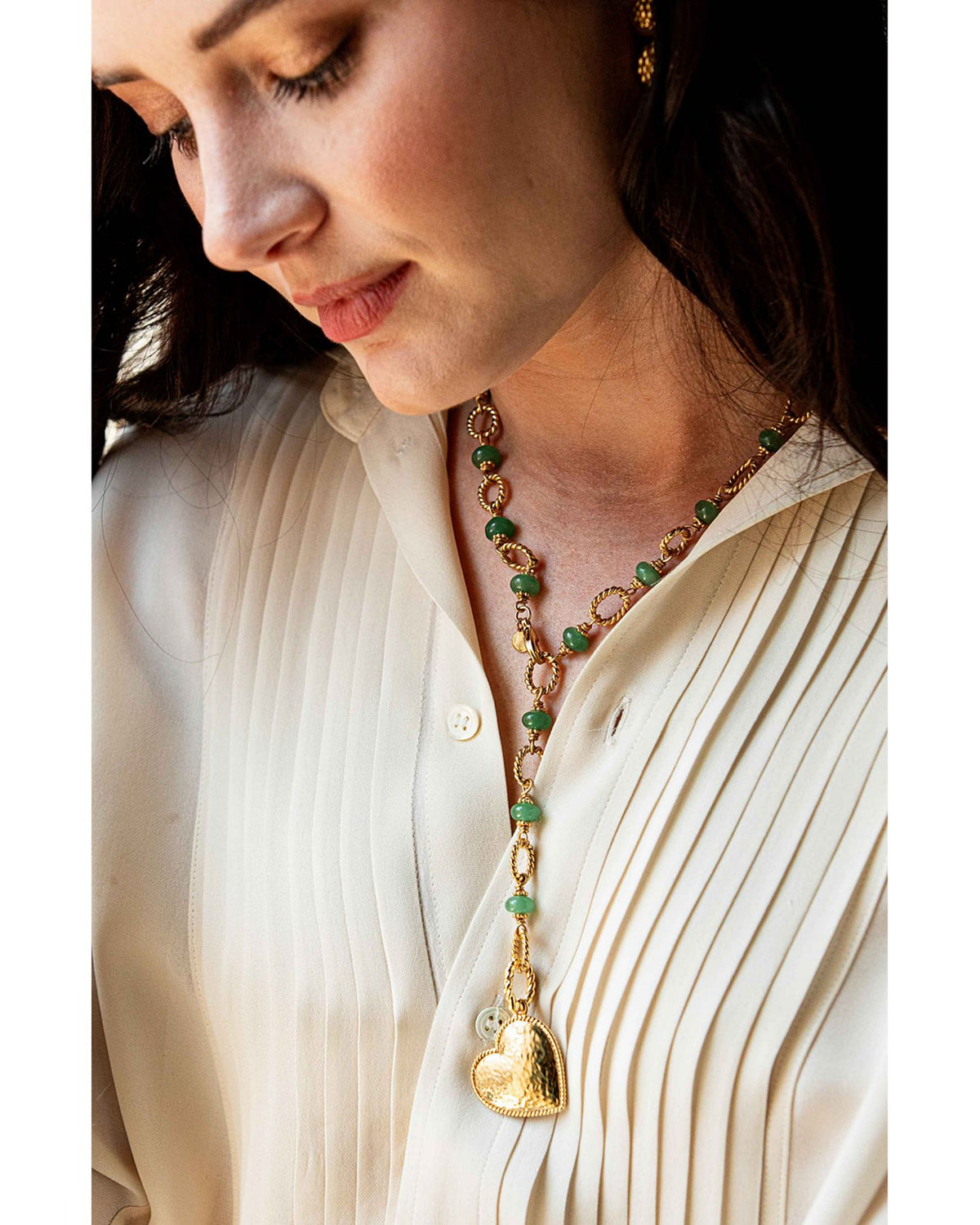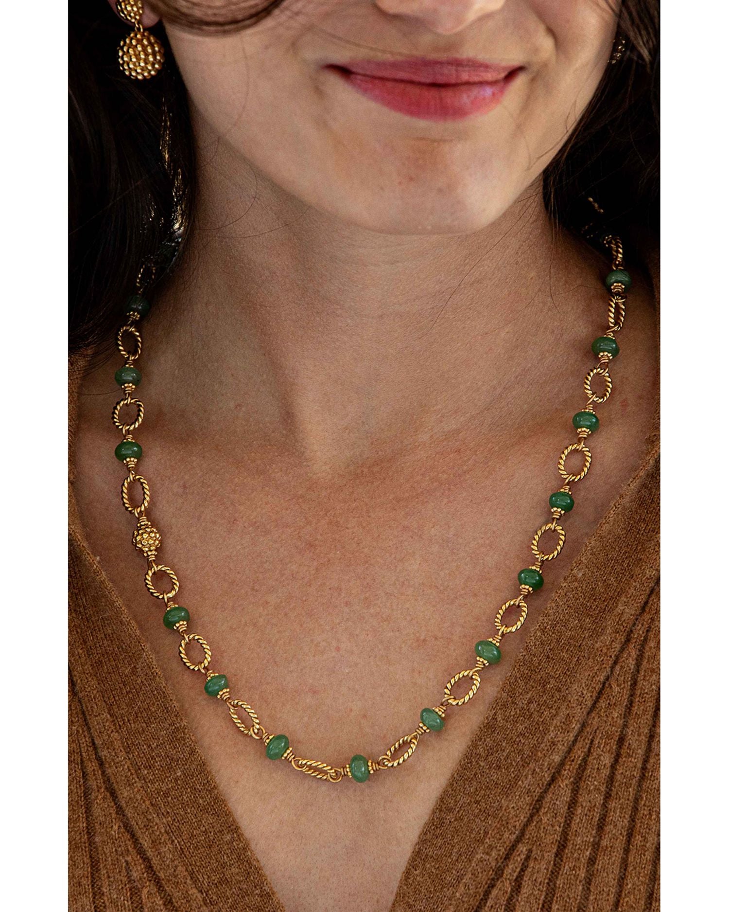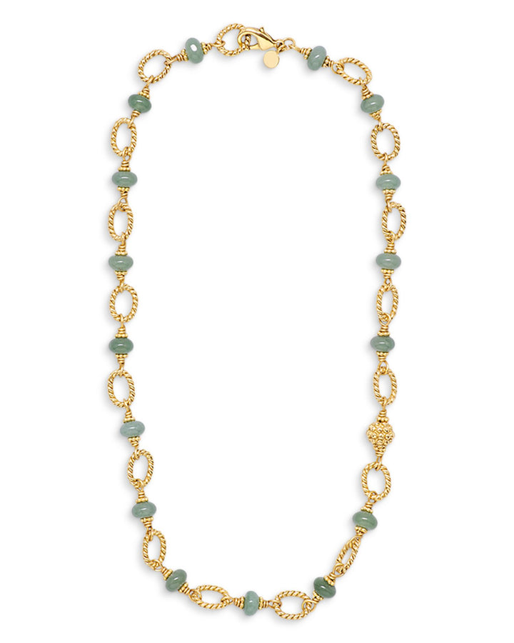 Crafted in 18K gold-plated metal with jade accents, this necklace measures 24 inches in length and secures with a lobster clasp closure. Made in India with meticulous craftsmanship.