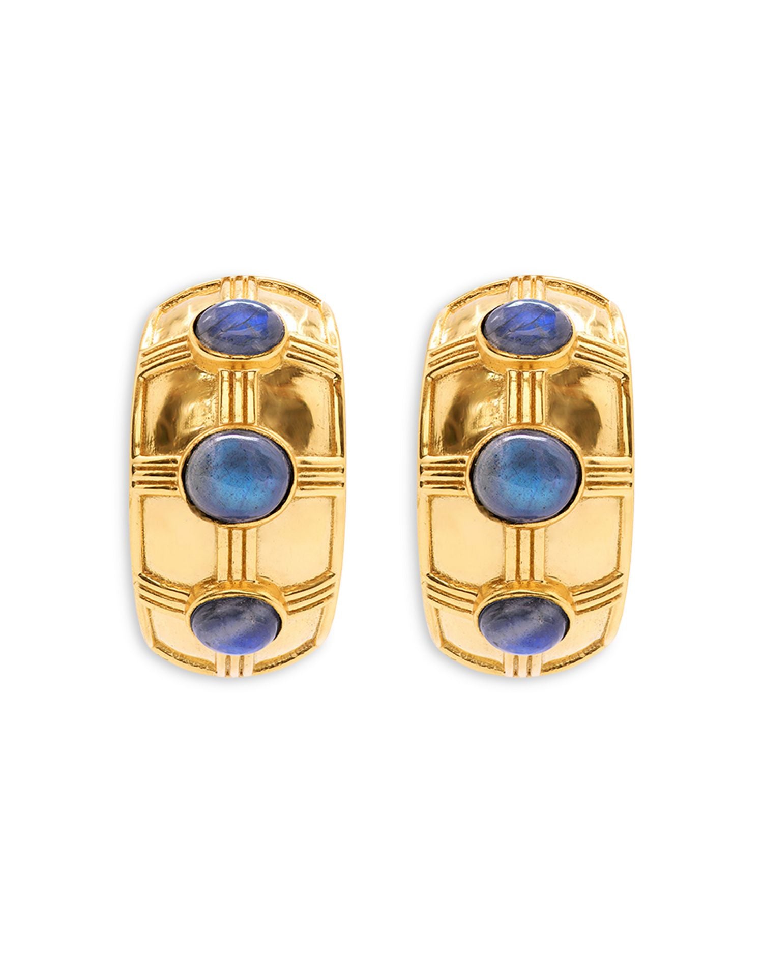 Handcrafted in 18K gold-plated metal with blue labradorite accents, these earrings measure 1 inch in length and 0.5 inches in width. They feature a post-back closure. Almost all gemstones, including labradorite, are treated to enhance their beauty. Made in India.
