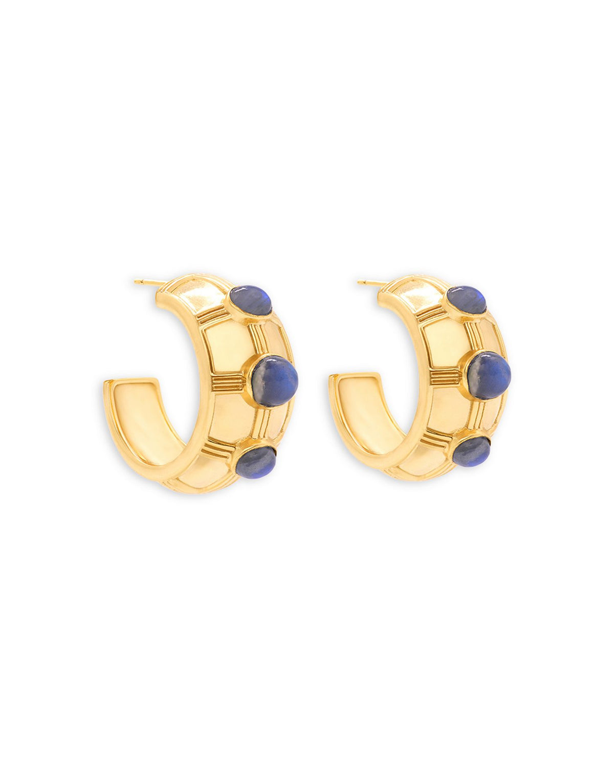 These Bold Labradorite Hoop Earrings by Capucine De Wulf are a striking addition to any jewelry collection. Featuring the mesmerizing glow of blue labradorite and a sleek hoop design, they are ideal for making a sophisticated statement. At 1 inch in length, they offer versatility and elegance for day-to-night wear.