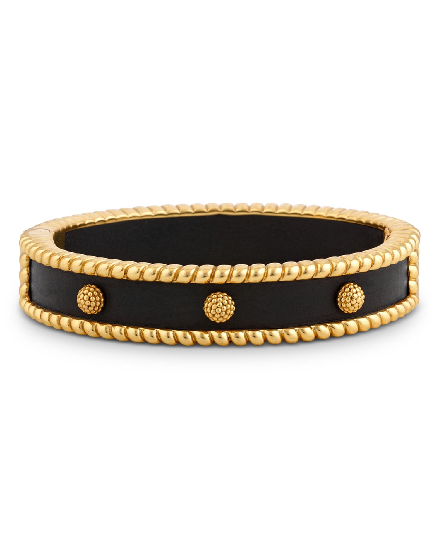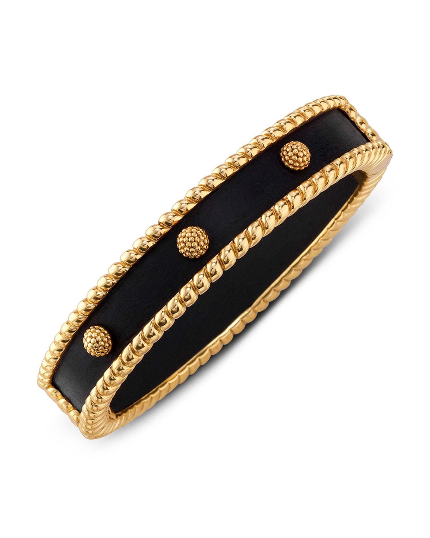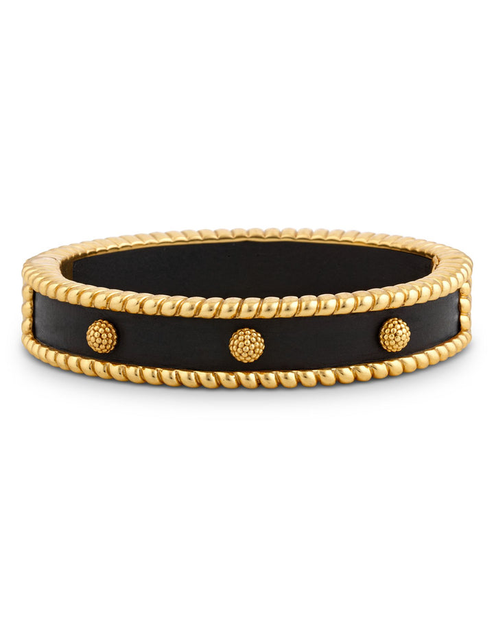 Made from 18K gold-plated brass with ebony accents, this bangle bracelet measures 2.4 inches in length and features a hinge closure. It is nickel-free and includes an anti-tarnish coating. Almost all gemstones and black diamonds are treated to enhance their beauty. Made in India.