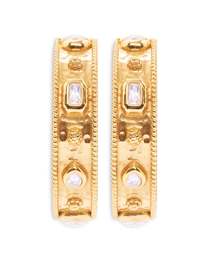 These Berry Hoop Earrings by Capucine De Wulf are a timeless addition to any jewelry collection. Featuring 18K gold plating and sparkling cubic zirconia accents, their 1.2-inch length and 0.4-inch width strike the perfect balance between understated elegance and bold design.