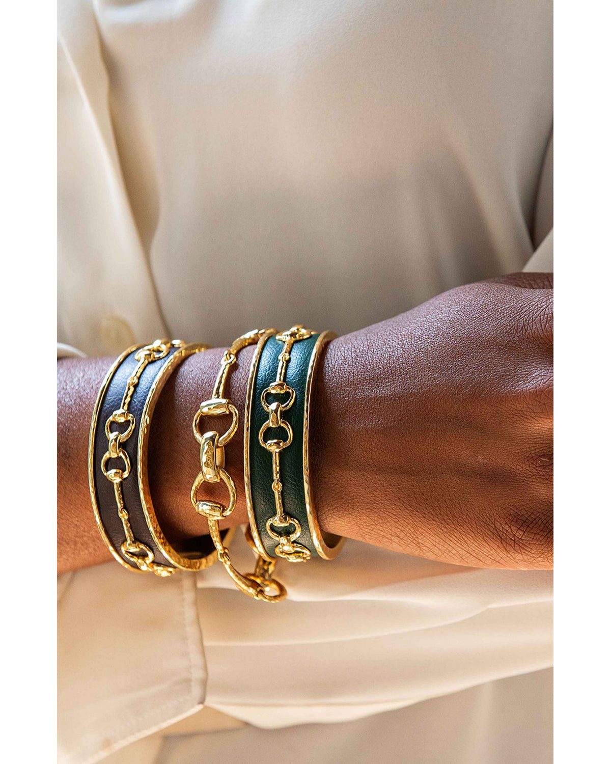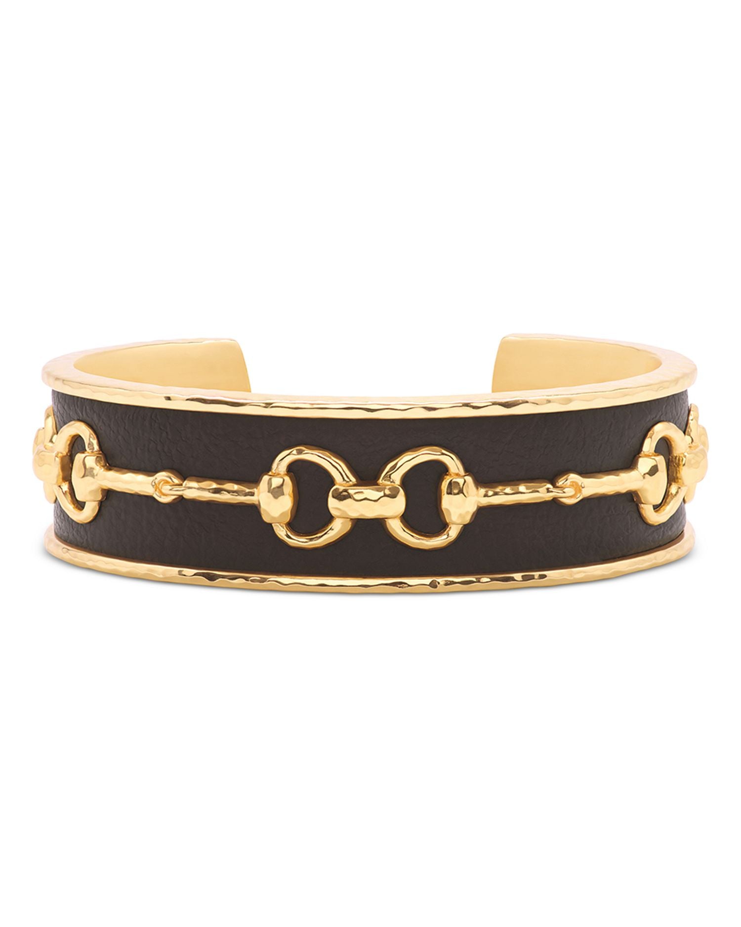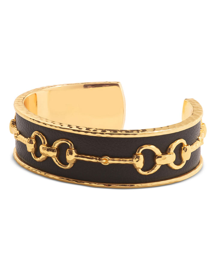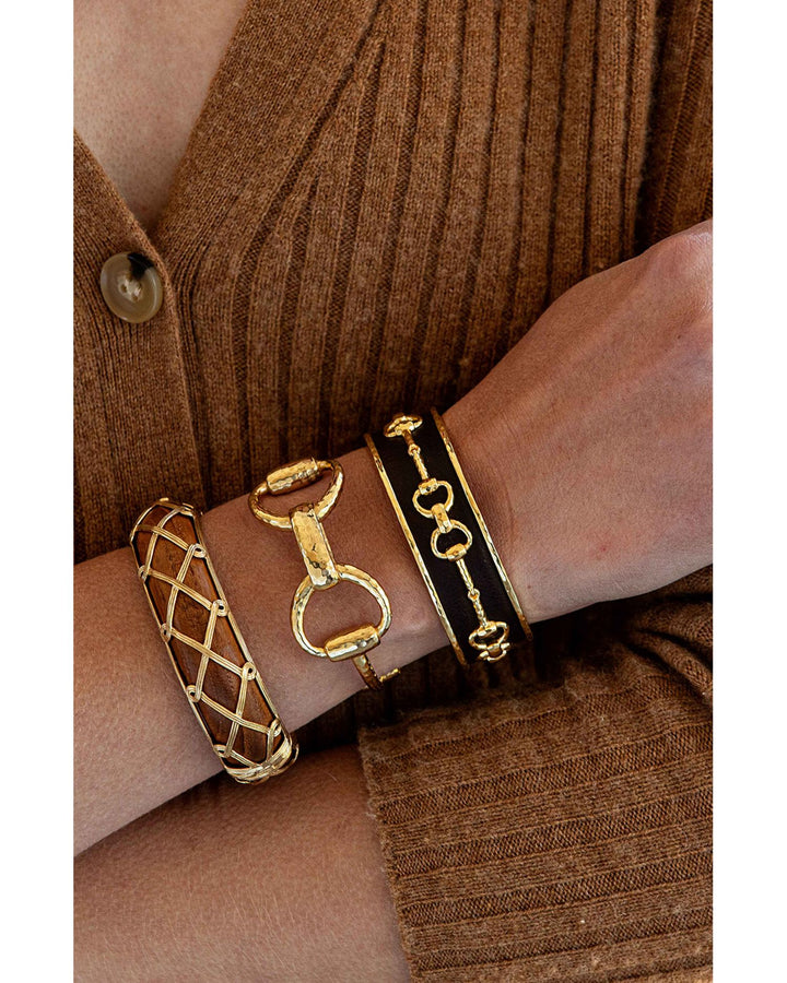 This Equestrian Snaffle Bit Cuff Bracelet by Capucine De Wulf is a refined tribute to equestrian style. Featuring 18K gold-plated brass and leather accents, its snaffle bit motif embodies classic sophistication and timeless charm. The 2.3-inch diameter slip-on design makes it a versatile and effortless accessory.