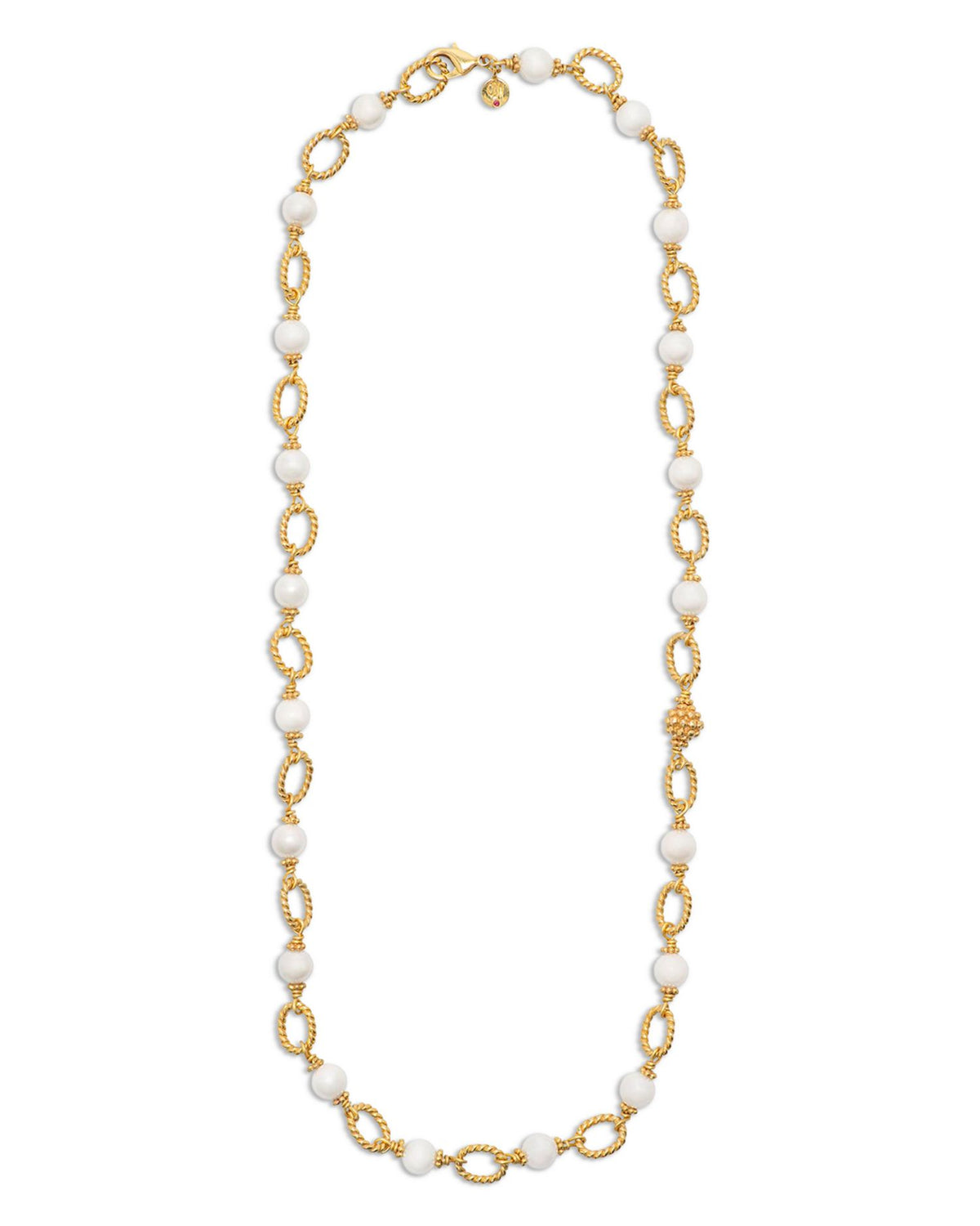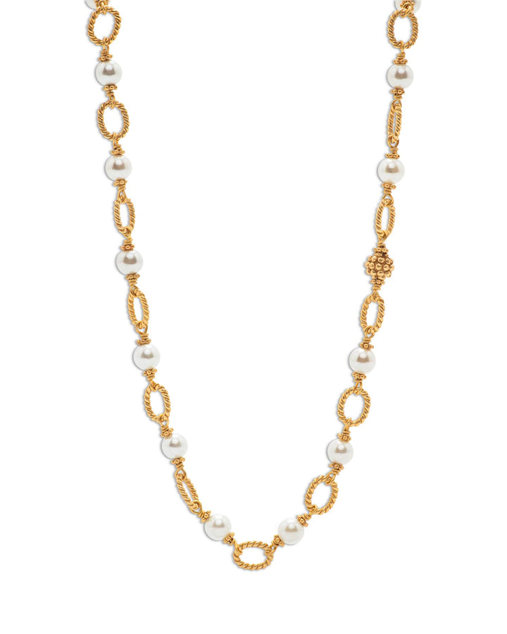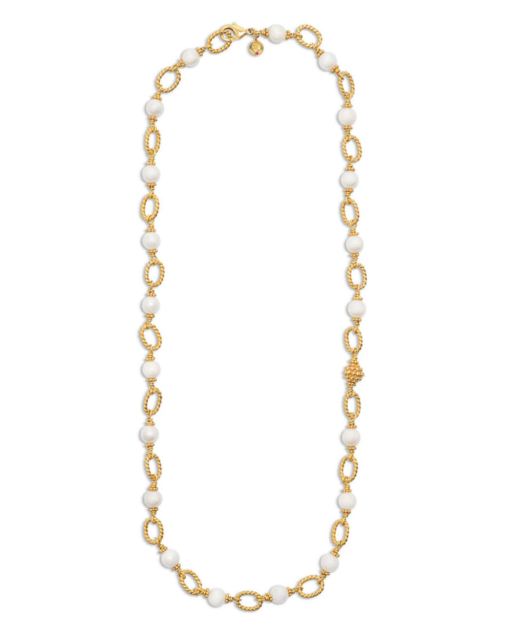 Crafted in 18K gold ion-plated brass with jade or imitation shell pearls, this necklace measures 24 inches in length and secures with a lobster clasp closure. Made in India, reflecting exceptional attention to detail.