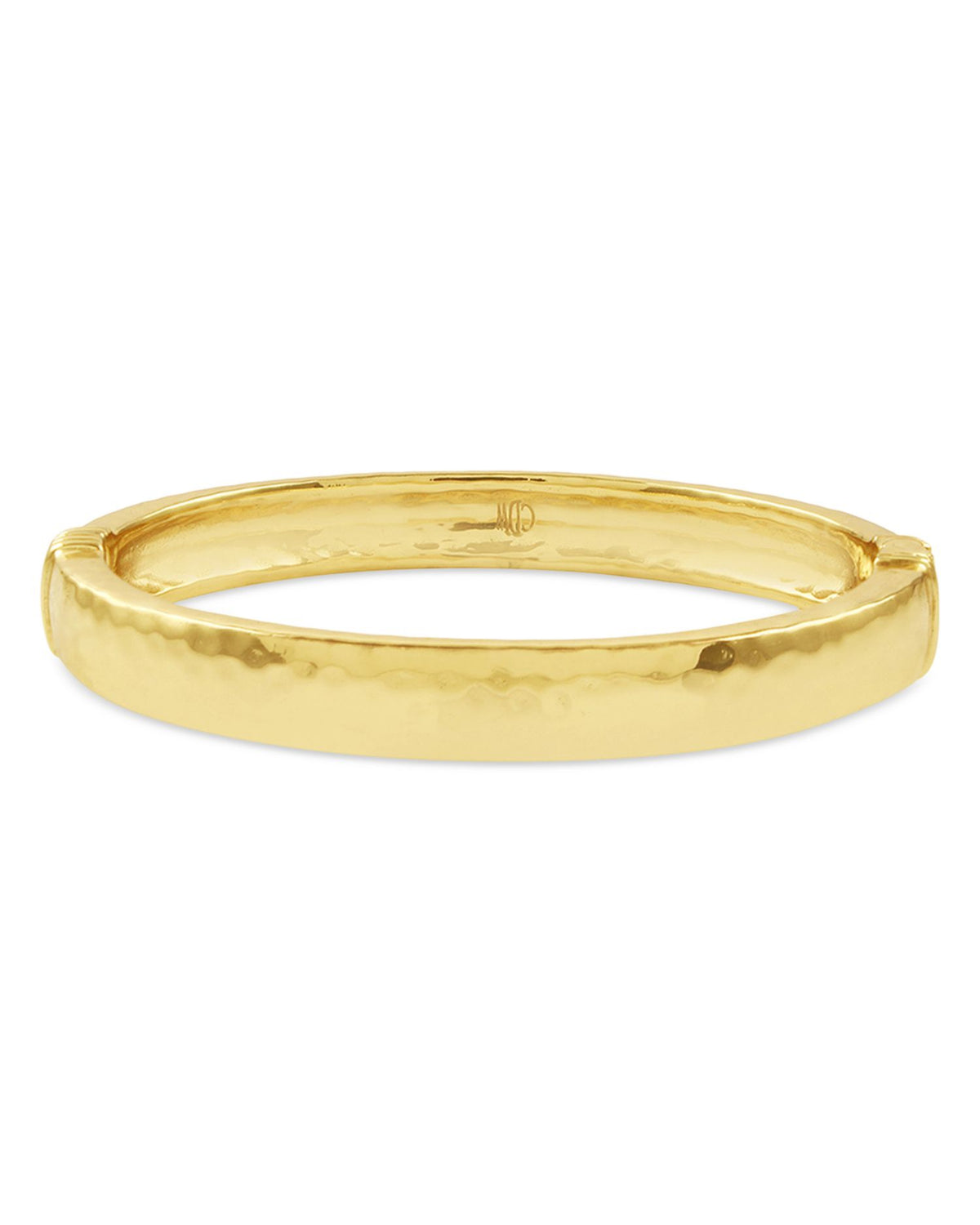Made in 18K yellow gold ion-plated brass, this bangle bracelet measures 2.36 inches in diameter and features a hinged closure. Made in India, showcasing expert craftsmanship.