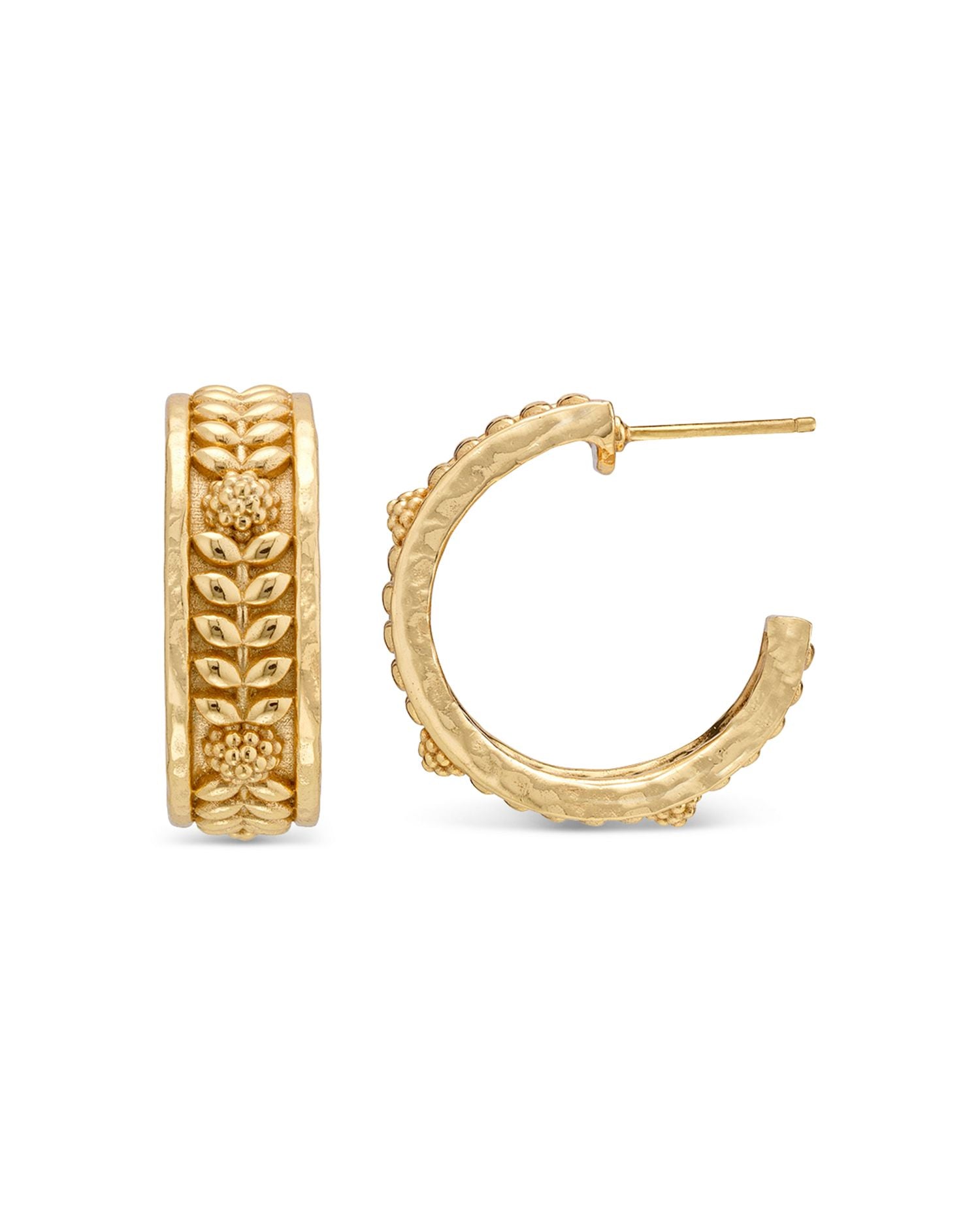 These Berry Vine Hoop Earrings by Capucine De Wulf from the Berry collection are a modern and organic take on the classic hoop. Their vine-like design and 18K gold-plated finish bring a touch of nature-inspired elegance. At 2.1 inches in diameter, they are perfect for making a bold statement.