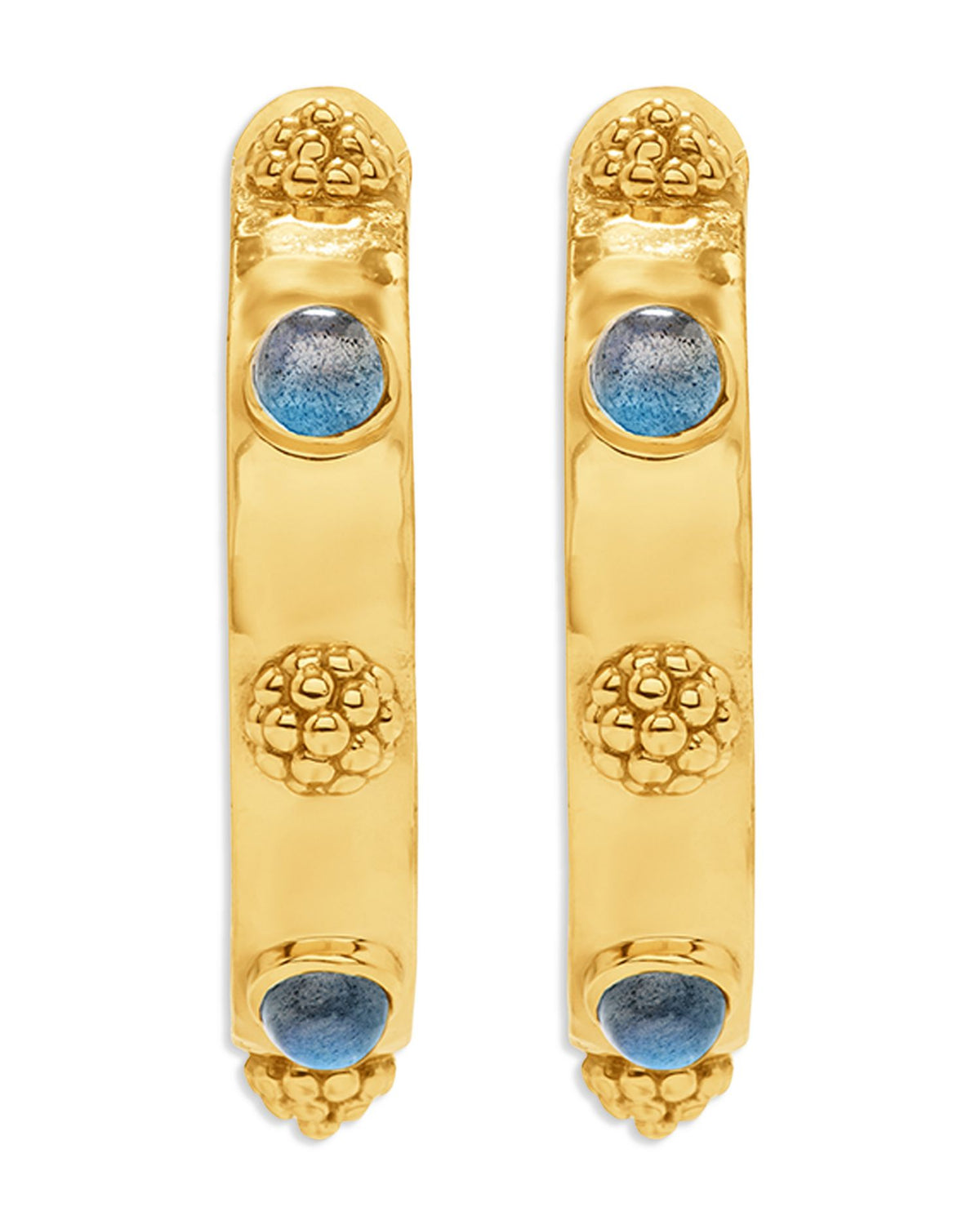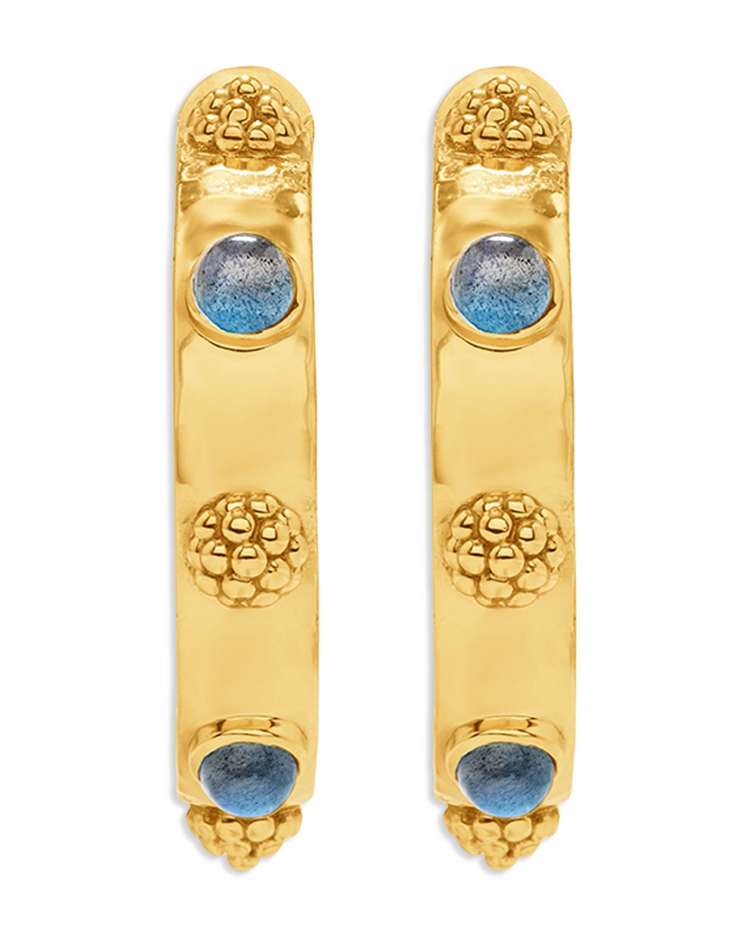 These Cleopatra Hoop Earrings by Capucine De Wulf from the Cleopatra collection are a sophisticated accessory that blends timeless elegance with vibrant detail. Featuring blue labradorite accents and a classic hoop design, their 1.3-inch length makes them perfect for both casual and formal occasions.