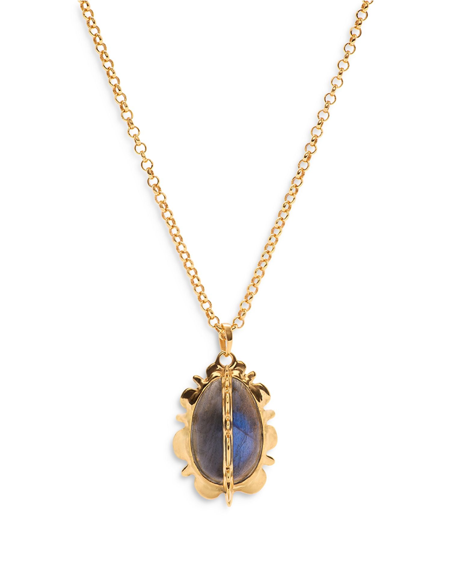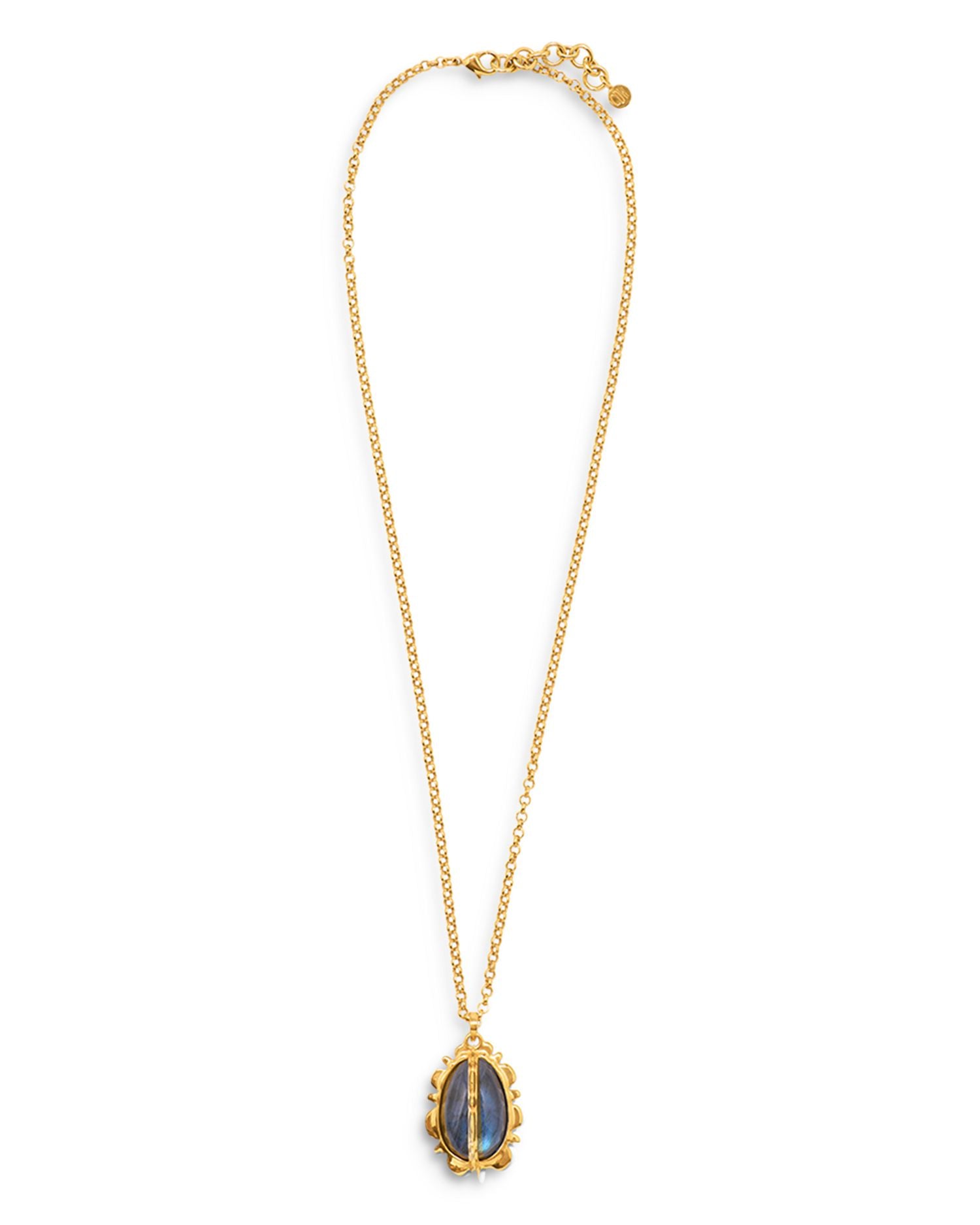 Crafted in 18K gold-plated brass with a blue labradorite pendant, this necklace features a 21-inch adjustable length and a 0.6-inch pendant. It secures with a lobster clasp closure and is nickel-free. Almost all gemstones are treated to enhance their beauty. Made in India.