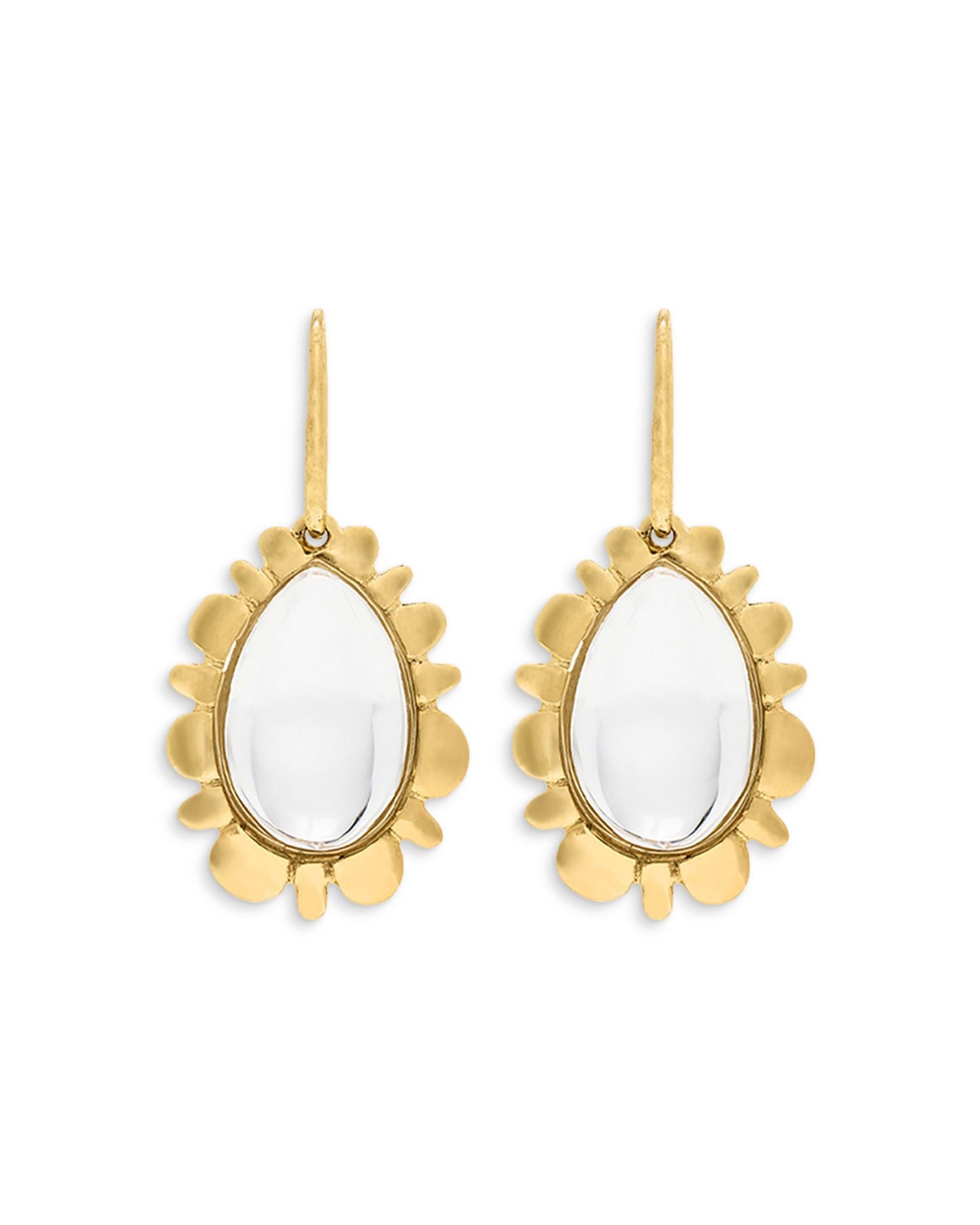 Crafted in 18K gold-plated brass with quartz accents, these earrings measure 1.5 inches in length and 0.8 inches in width. They feature a French wire closure. Made in India with exceptional craftsmanship.