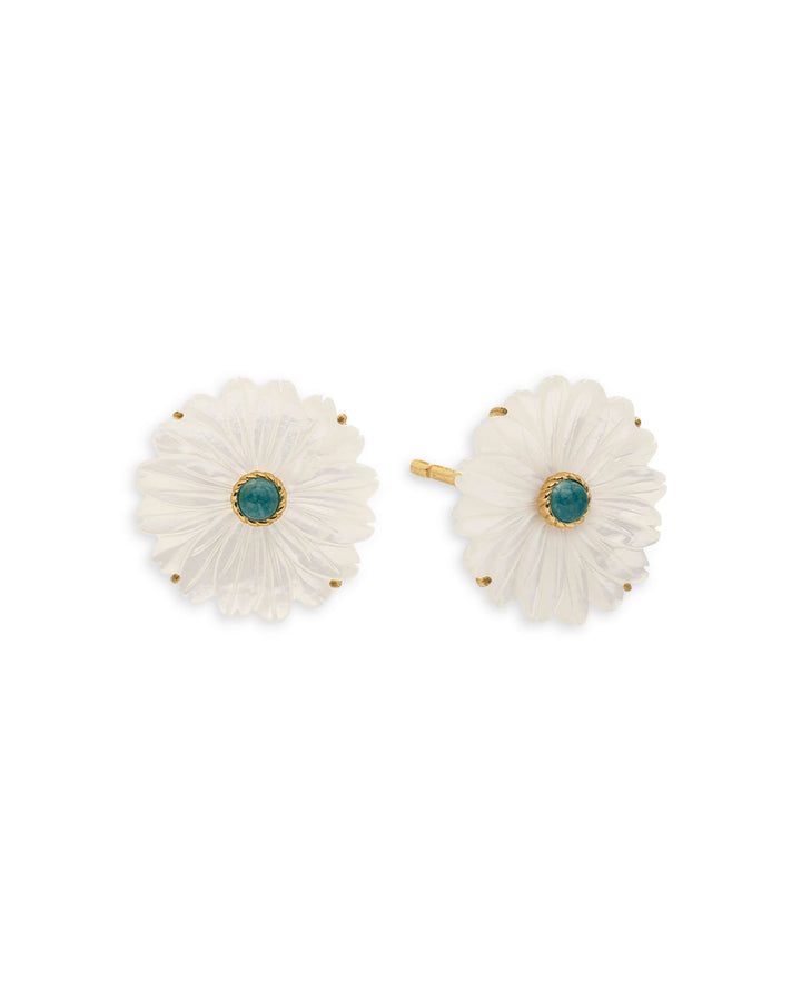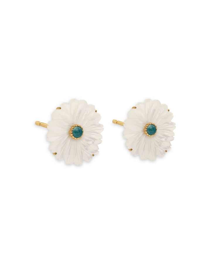 These Mermaid Garden Mother of Pearl Flower Stud Earrings by Capucine De Wulf from the Mermaid Garden collection are a delicate and enchanting addition to your jewelry wardrobe. Featuring mother-of-pearl flowers accented with ocean jade, their 1.2-inch length adds a whimsical touch to any look.