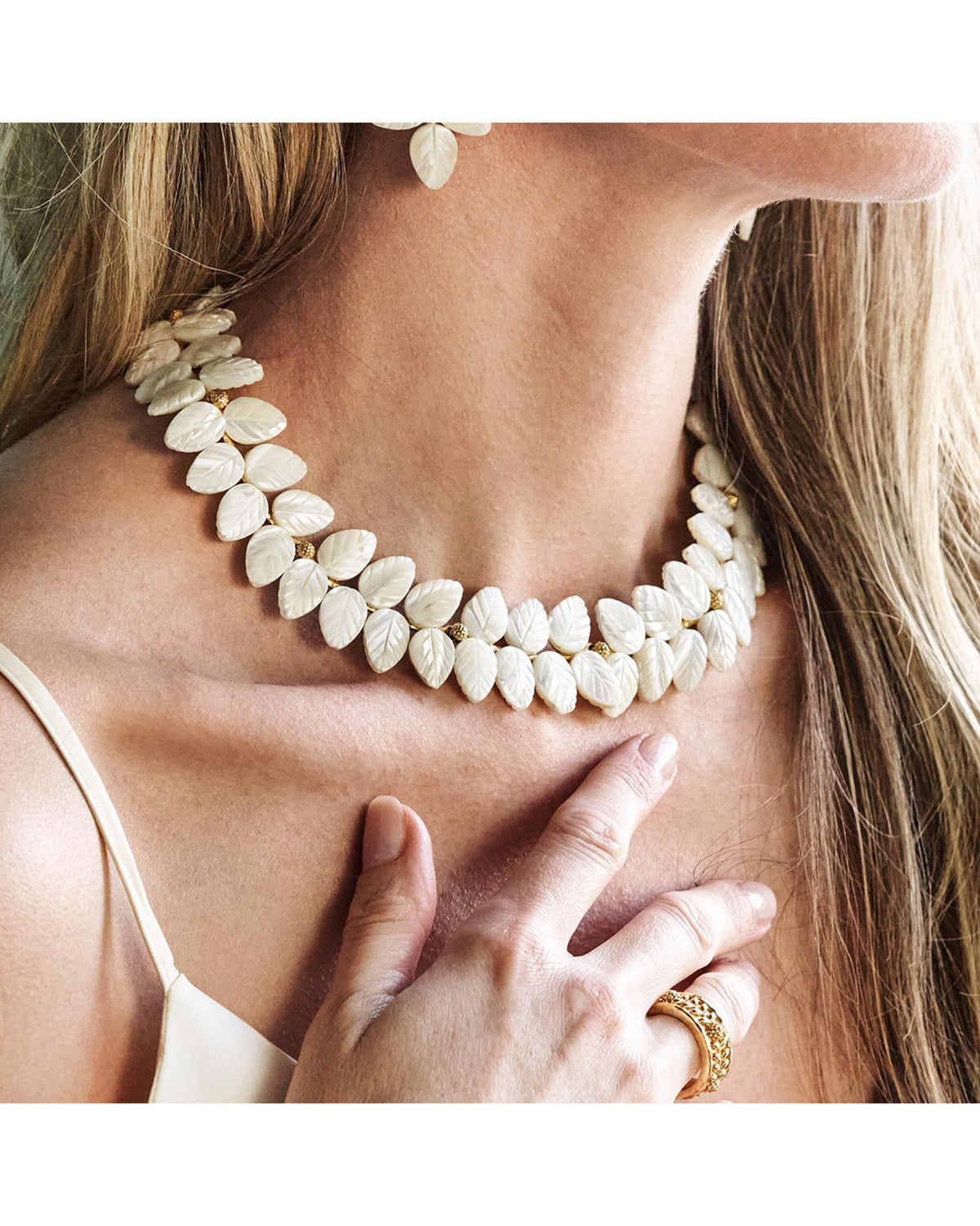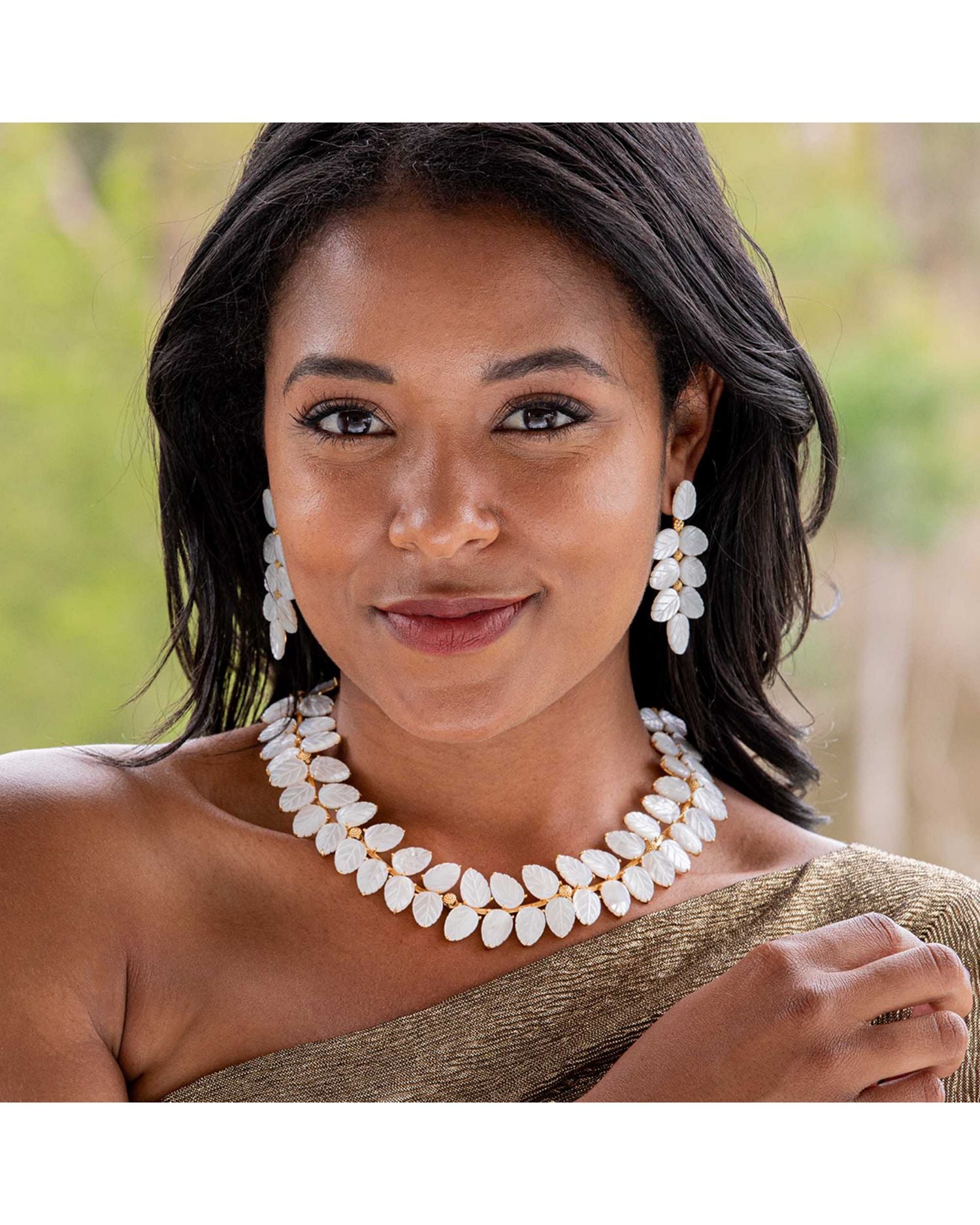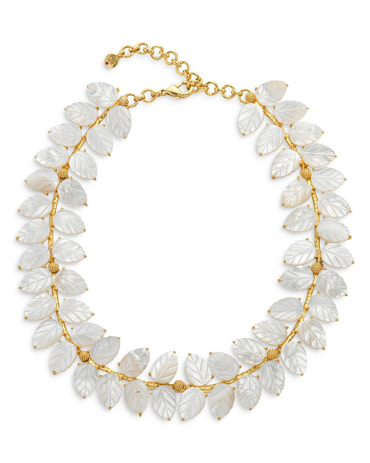Made in 18K gold-plated brass with mother-of-pearl accents, this necklace measures 17 inches in length and secures with a lobster clasp closure. Made in India with artisanal quality.