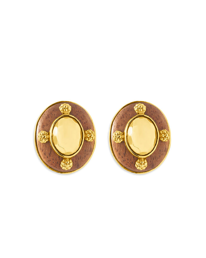 Made in teak wood and 18K yellow gold-plated brass, these earrings measure 0.45 inches in length and feature a secure post-back closure. Crafted with artisanal attention to detail.