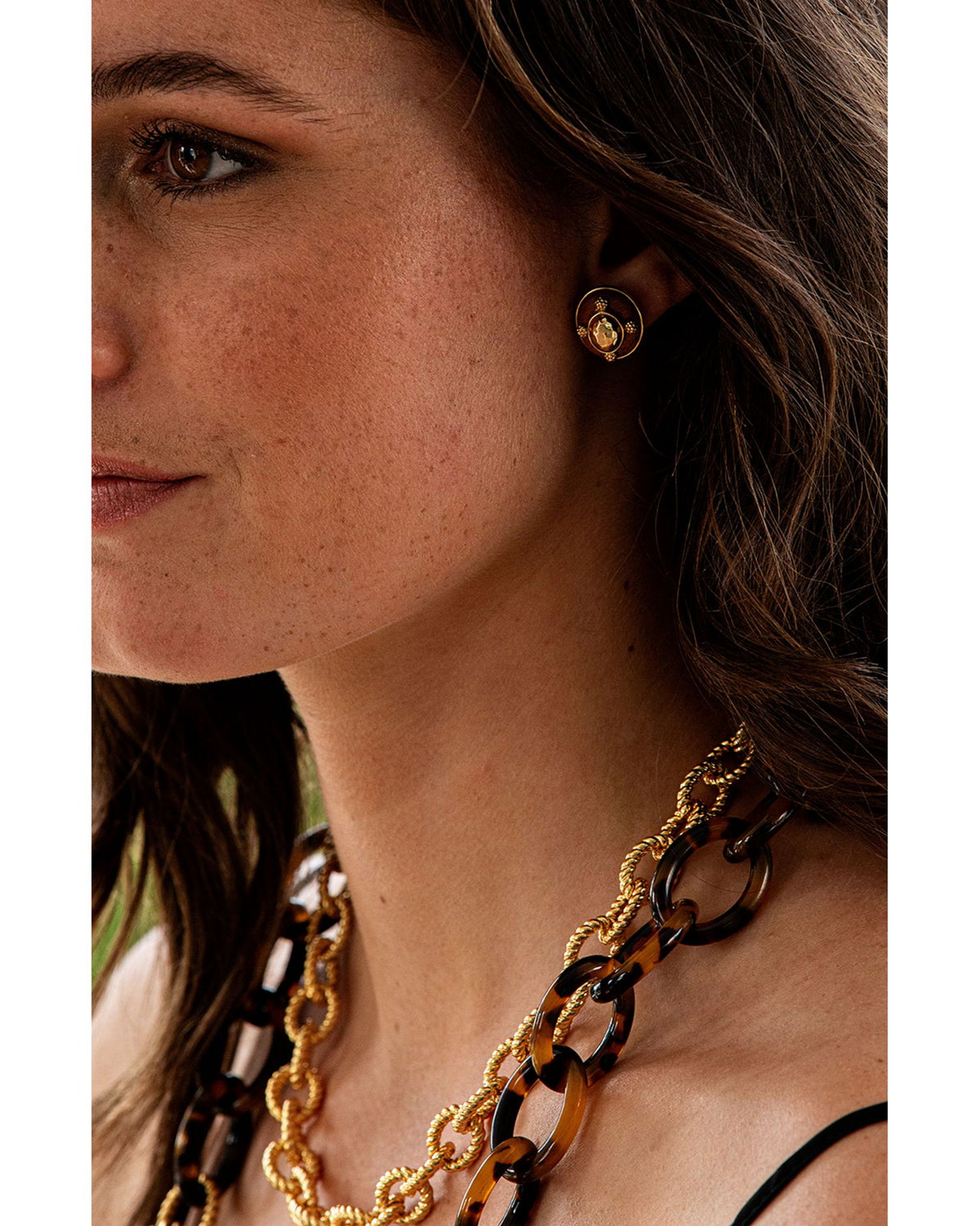 These Gaia Teak Hammered Style Stud Earrings by Capucine De Wulf from the Gaia collection blend natural textures with modern design. Featuring hand-carved teak wood and a hammered gold-plated finish, their petite 0.45-inch size makes them a versatile accessory for everyday wear.