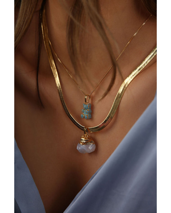 This Medusa Flat Chain Necklace by Crystal Haze is a sleek and contemporary accessory. Featuring a bold flat chain design in 18K gold-plated brass, its 20-inch length makes it versatile for layering or wearing solo as a statement piece.
