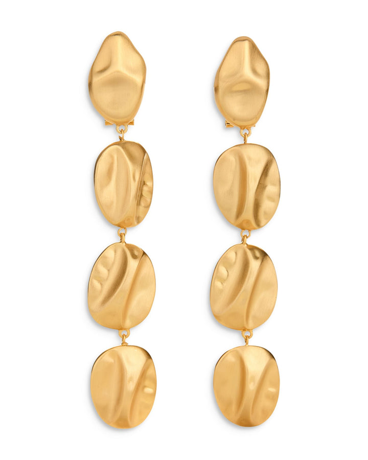 These Veda Nugget Linear Drop Earrings by Cult Gaia from the Veda collection are a unique and sculptural statement piece. Featuring elongated gold-tone nuggets arranged in a linear design, their 4.2-inch length adds sophistication and drama to any look. The omega clip closure ensures secure wear.