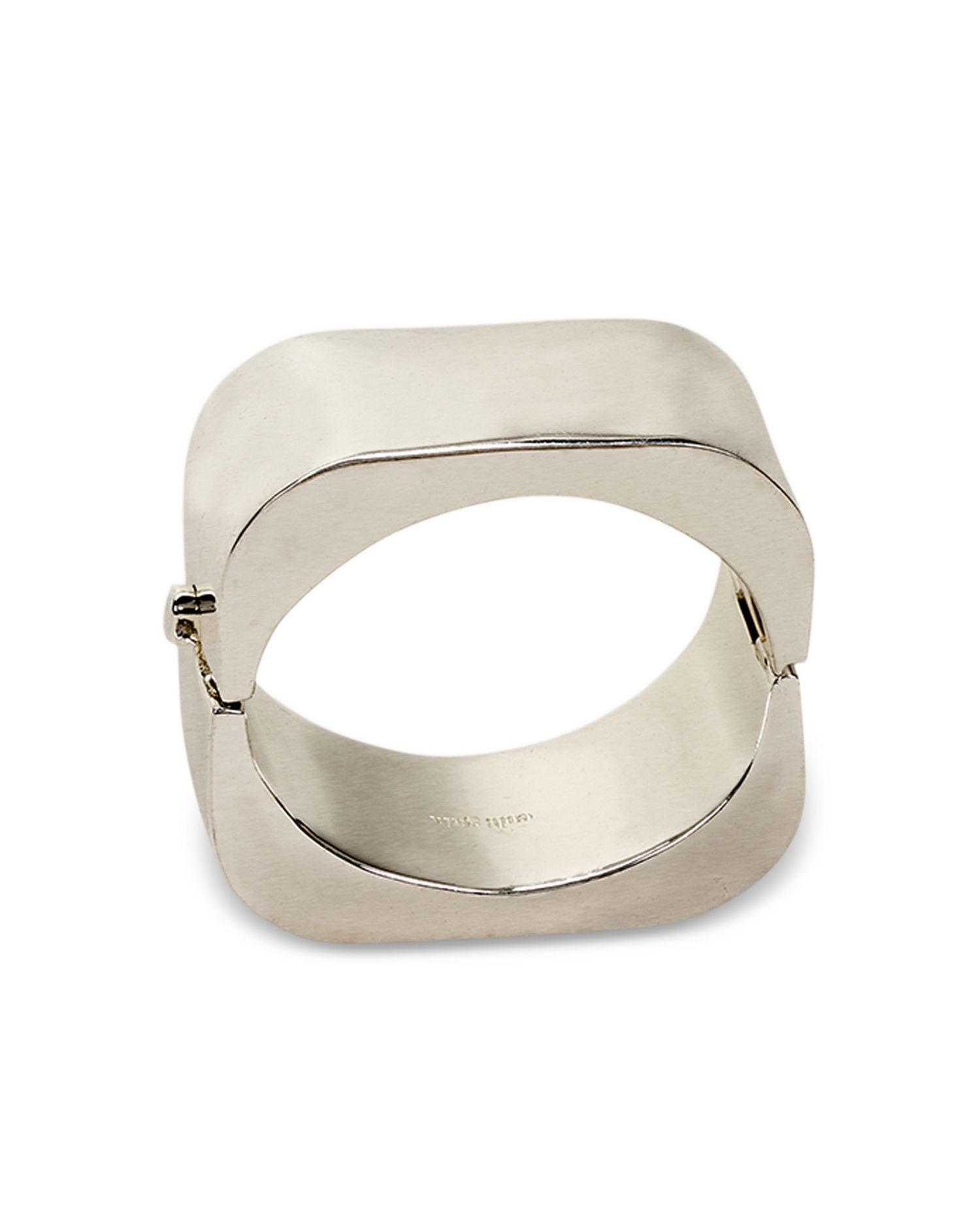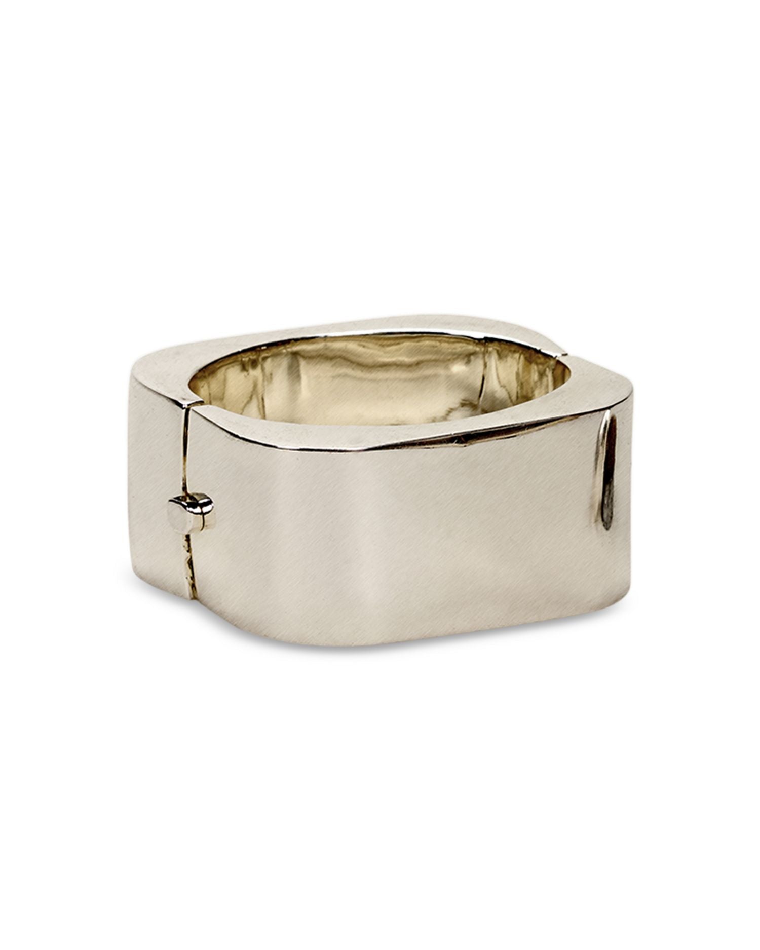 Made in brass, this cuff bracelet measures 1.3 inches wide and 2.7 inches in diameter. It features a hinge closure for secure and comfortable wear.
