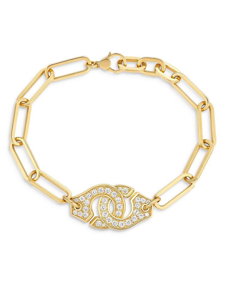 This 18K Yellow Gold Menottes Diamond Chain Bracelet by Dinh Van from the Menottes collection is a classic and elegant design. Featuring interlocking diamond stations totaling 0.93 carats, its 7.75-inch length is perfect for elevating any outfit.